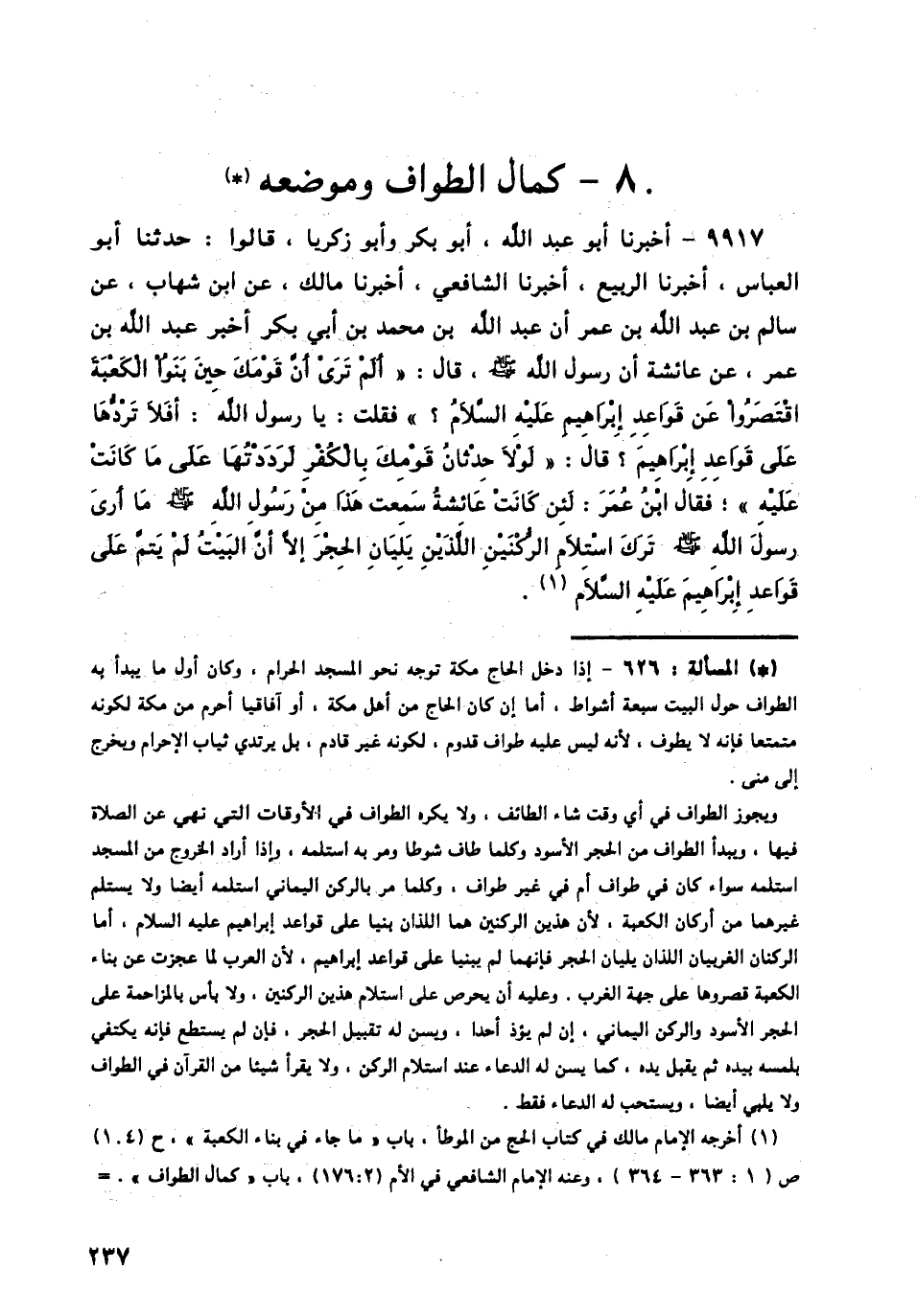 9917 - أَخْبَرَنَا أَبُو عَبْدِ اللَّهِ، وَأَبُو بَكْرٍ، وَأَبُو زَكَرِيَّا، قَالُوا: حَدَّثَنَا أَبُو الْعَبَّاسِ، أَخْبَرَنَا الرَّبِيعُ، أَخْبَرَنَا الشَّافِعِيُّ، أَخْبَرَنَا مَالِكٌ، عَنِ ابْنِ شِهَابٍ، عَنْ سَالِمِ بْنِ عَبْدِ اللَّهِ بْنِ عُمَرَ، أَنَّ عَبْدَ اللَّهِ بْنَ مُحَمَّدِ بْنِ أَبِي بَكْرٍ، أَخْبَرَ عَبْدَ اللَّهِ بْنَ عُمَرَ، عَنْ عَائِشَةَ: أَنَّ رَسُولَ اللَّهِ صَلَّى اللهُ عَلَيْهِ وَسَلَّمَ قَالَ: § «أَلَمْ تَرَ أَنَّ قَوْمَكِ حِينَ بَنَوْا الْكَعْبَةَ اقْتَصَرُوا عَنْ قَوَاعِدِ إِبْرَاهِيمَ عَلَيْهِ السَّلَامُ؟» فَقُلْتُ: يَا رَسُولَ اللَّهِ: أَفَلَا تَرُدُّهَا عَلَى قَوَاعِدِ إِبْرَاهِيمَ؟ قَالَ: «لَوْلَا حِدْثَانُ قَوْمِكِ بِالْكُفْرِ لَرَدَدْتُهَا عَلَى مَا كَانَتْ عَلَيْهِ» فَقَالَ ابْنُ عُمَرَ: لَئِنْ كَانَتْ عَائِشَةُ سَمِعَتْ هَذَا مِنْ رَسُولِ اللَّهِ صَلَّى اللهُ عَلَيْهِ وَسَلَّمَ مَا أَرَى رَسُولُ اللَّهِ صَلَّى اللهُ عَلَيْهِ وَسَلَّمَ تَرْكَ اسْتِلَامِ الرُّكْنَيْنِ اللَّذَيْنِ يَلِيَانِ الْحَجَرَ، إِلَّا أَنَّ الْبَيْتَ لَمْ يَتِمَّ عَلَى قَوَاعِدِ إِبْرَاهِيمَ عَلَيْهِ السَّلَامُ " -[238]- أَخْرَجَهُ الْبُخَارِيُّ، وَمُسْلِمٌ فِي الصَّحِيحِ، مِنْ حَدِيثِ مَالِكٍ