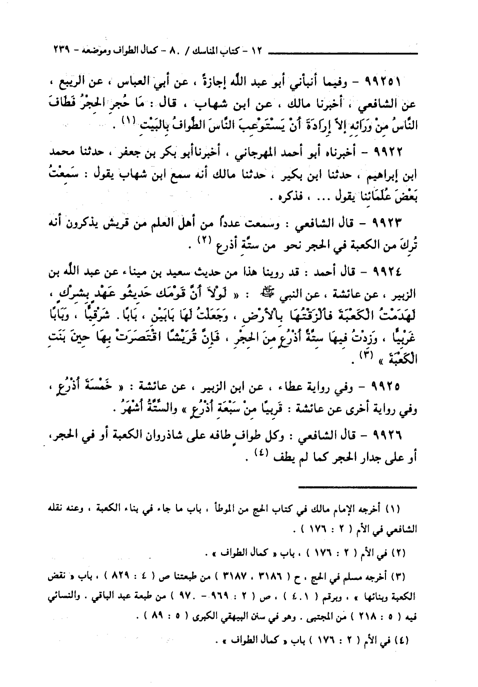 9923 - قَالَ الشَّافِعِيُّ وَسَمِعْتُ عَدَدًا مِنْ أَهْلِ الْعِلْمِ مِنْ قُرَيْشٍ يَذْكُرُونَ أَنَّهُ تُرِكَ مِنَ الْكَعْبَةِ فِي الْحِجْرِ نَحْوٌ مِنْ سِتَّةِ أَذْرُعٍ
