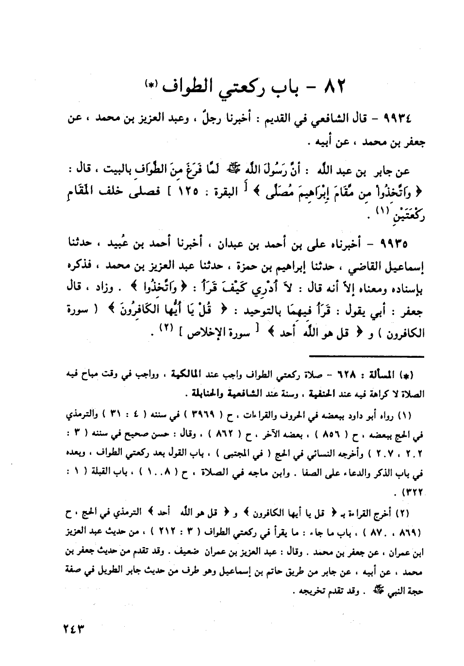 9935 - أَخْبَرَنَاهُ عَلِيُّ بْنُ أَحْمَدَ بْنِ عَبْدَانَ، أَخْبَرَنَا أَحْمَدُ بْنُ عُبَيْدٍ، حَدَّثَنَا إِسْمَاعِيلُ الْقَاضِي، حَدَّثَنَا إِبْرَاهِيمُ بْنُ حَمْزَةَ، حَدَّثَنَا عَبْدُ الْعَزِيزِ بْنُ مُحَمَّدٍ، فَذَكَرَهُ بِإِسْنَادِهِ وَمَعْنَاهُ إِلَّا أَنَّهُ قَالَ: لَا أَدْرِي كَيْفَ قَرَأَ: {وَاتَّخِذُوا} [البقرة: 125]. وَزَادَ قَالَ جَعْفَرٌ: أَبِي، يَقُولُ: قَرَأَ فِيهِمَا بِالتَّوْحِيدِ: قُلْ يَا أَيُّهَا الْكَافِرُونَ، وَقُلْ هُوَ اللَّهُ أَحَدٌ