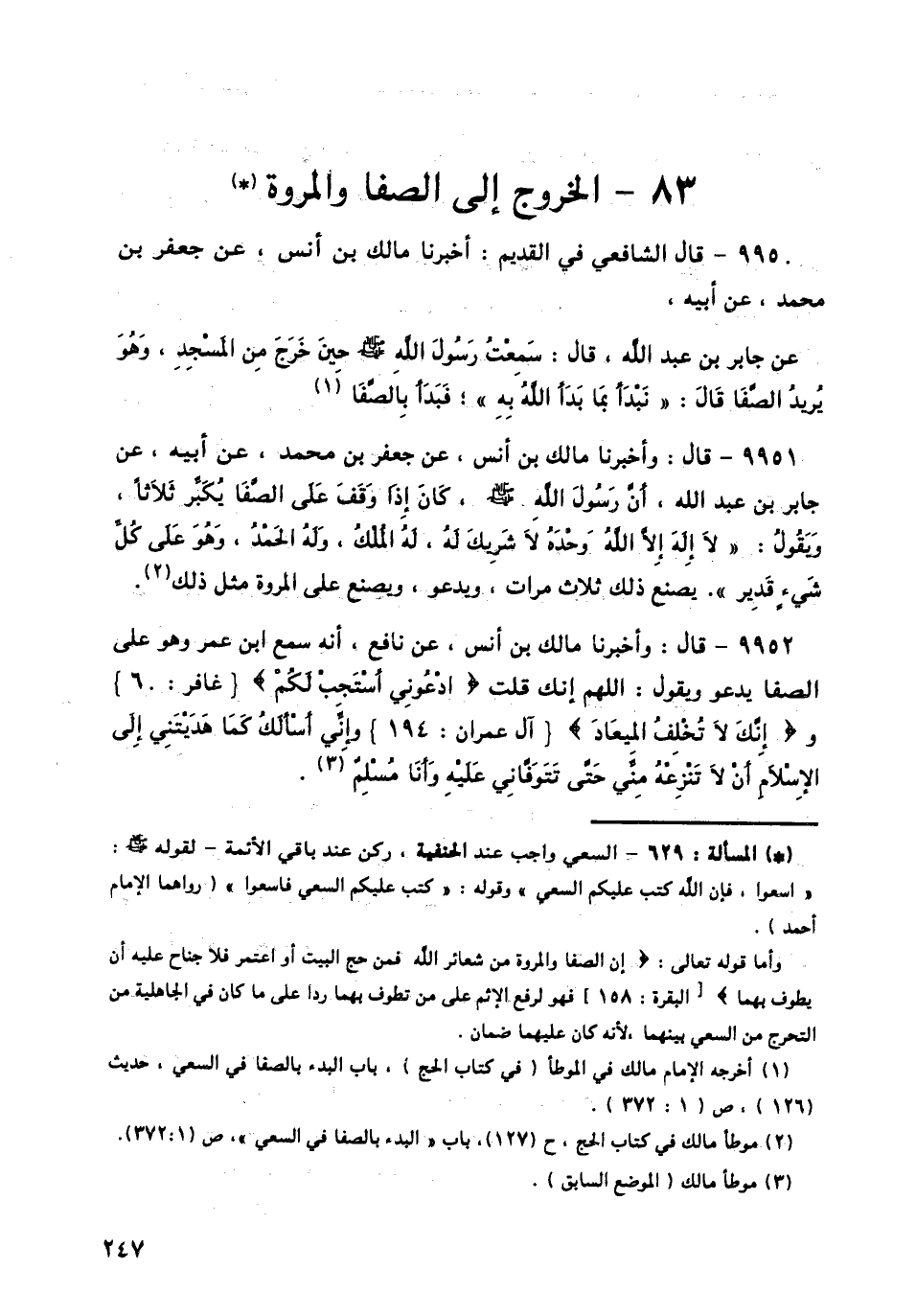 9950 - قَالَ الشَّافِعِيُّ فِي الْقَدِيمِ: أَخْبَرَنَا مَالِكُ بْنُ أَنَسٍ، عَنْ جَعْفَرِ بْنِ مُحَمَّدٍ، عَنْ أَبِيهِ، عَنْ جَابِرِ بْنِ عَبْدِ اللَّهِ قَالَ: سَمِعْتُ رَسُولَ اللَّهِ صَلَّى اللهُ عَلَيْهِ وَسَلَّمَ حِينَ خَرَجَ مِنَ الْمَسْجِدِ، وَهُوَ يُرِيدُ الصَّفَا قَالَ: «نَبْدَأُ بِمَا بَدَأَ اللَّهُ بِهِ»، فَبَدَأَ بِالصَّفَا "