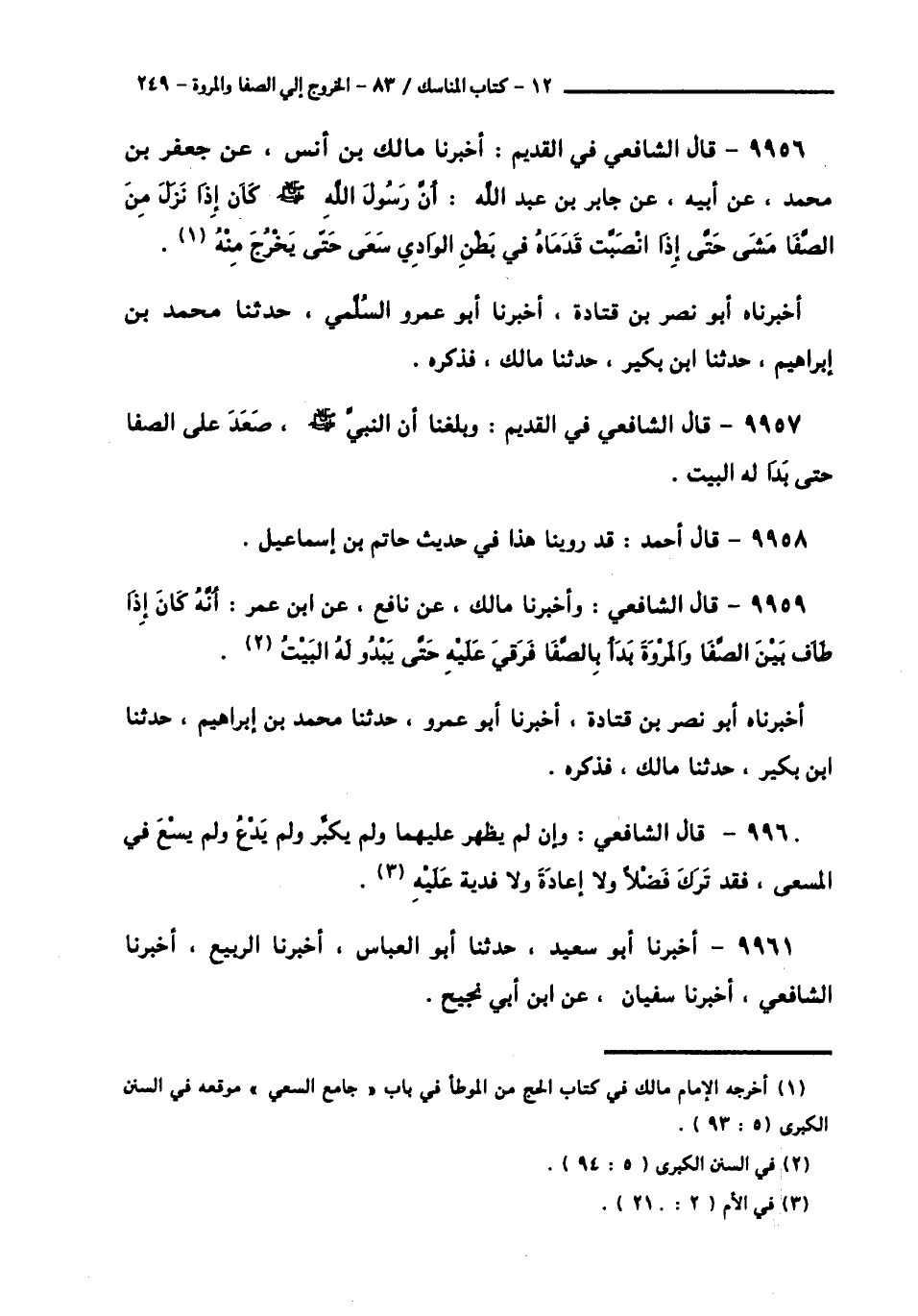 9956 - قَالَ الشَّافِعِيُّ فِي الْقَدِيمِ: أَخْبَرَنَا مَالِكُ بْنُ أَنَسٍ، عَنْ جَعْفَرِ بْنِ مُحَمَّدٍ، عَنْ أَبِيهِ، عَنْ جَابِرِ بْنِ عَبْدِ اللَّهِ: أَنَّ رَسُولَ اللَّهِ صَلَّى اللهُ عَلَيْهِ وَسَلَّمَ كَانَ إِذَا § «نَزَلَ مِنَ الصَّفَا مَشَى حَتَّى إِذَا أَنْصَبَّتْ قَدَمَاهُ فِي بَطْنِ الْوَادِي سَعَى حَتَّى يَخْرُجَ مِنْهُ». أَخْبَرَنَاهُ أَبُو نَصْرِ بْنُ قَتَادَةَ، أَخْبَرَنَا أَبُو عَمْرٍو السُّلَمِيُّ، حَدَّثَنَا مُحَمَّدُ بْنُ إِبْرَاهِيمَ، حَدَّثَنَا ابْنُ بُكَيْرٍ، حَدَّثَنَا مَالِكٌ، فَذَكَرَهُ