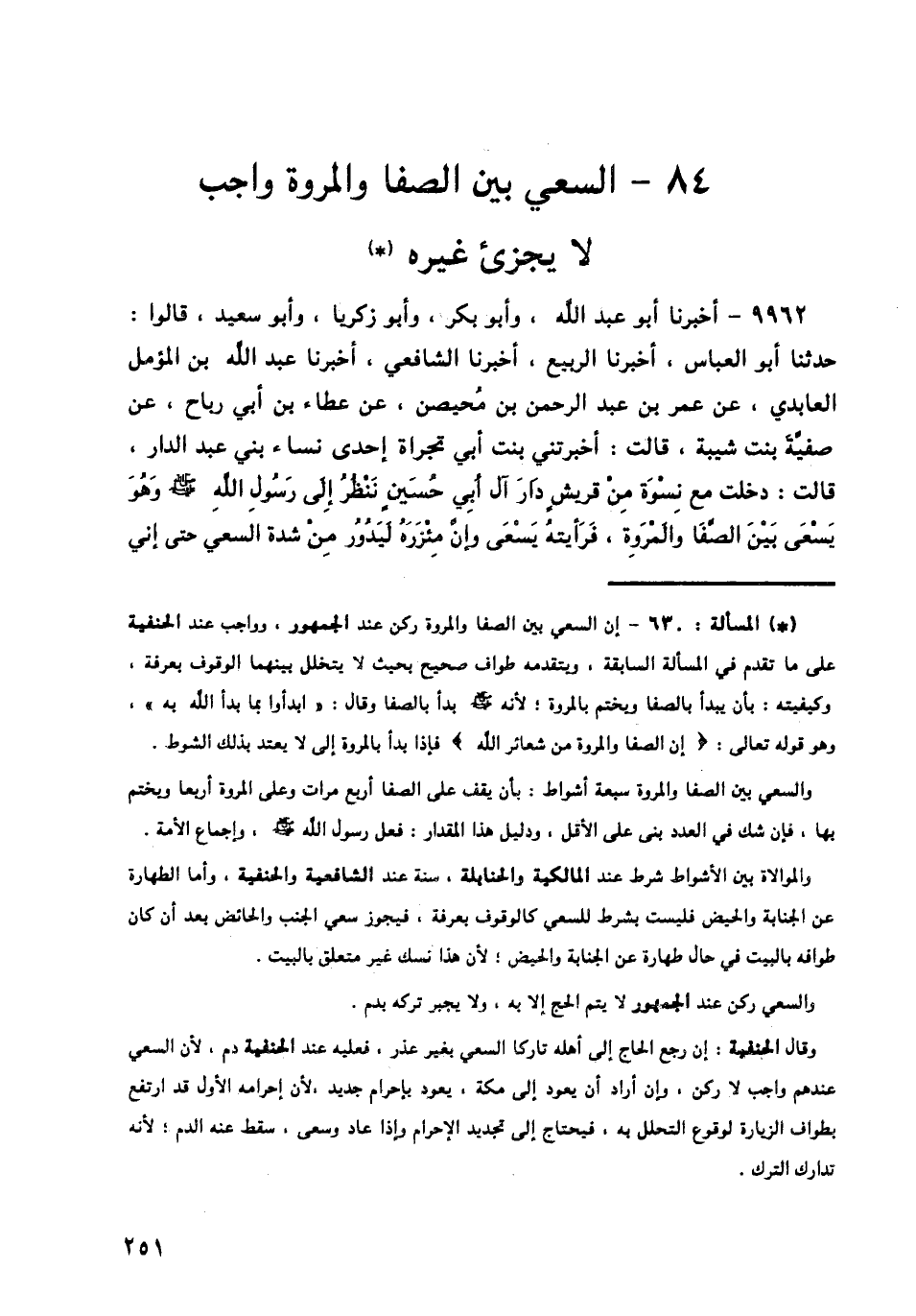 9962 - أَخْبَرَنَا أَبُو عَبْدِ اللَّهِ، وَأَبُو بَكْرٍ، وَأَبُو زَكَرِيَّا، وَأَبُو سَعِيدٍ، قَالُوا: حَدَّثَنَا أَبُو الْعَبَّاسِ، أَخْبَرَنَا الرَّبِيعُ، أَخْبَرَنَا الشَّافِعِيُّ، أَخْبَرَنَا عَبْدُ اللَّهِ بْنُ الْمُؤَمَّلِ الْعَابِدِيُّ، عَنْ عُمَرَ بْنِ عَبْدِ الرَّحْمَنِ بْنِ مُحَيْصِنٍ، عَنْ عَطَاءِ بْنِ أَبِي رَبَاحٍ، عَنْ صَفِيَّةَ بِنْتِ شَيْبَةَ قَالَتْ: أَخْبَرَتْنِي بِنْتُ أَبِي تَجْرَاةَ، إِحْدَى نِسَاءِ بَنِي عَبْدِ الدَّارِ قَالَتْ: دَخَلْتُ مَعَ نِسْوَةٍ مِنْ قُرَيْشٍ دَارَ آلِ أَبِي حُسَيْنٍ نَنْظُرُ إِلَى رَسُولِ اللَّهِ صَلَّى اللهُ عَلَيْهِ وَسَلَّمَ، وَهُوَ يَسْعَى بَيْنَ الصَّفَا، وَالْمَرْوَةِ، فَرَأَيْتُهُ يَسْعَى، وَإِنَّ مِئْزَرَهُ لَيَدُورُ مِنْ شِدَّةِ السَّعْيِ حَتَّى إِنِّي -[252]- لَأَقُولُ: إِنِّي لَأَرَى رُكْبَتَيْهِ، وَسَمِعْتُهُ، يَقُولُ: «§اسْعَوْا، فَإِنَّ اللَّهَ كَتَبَ عَلَيْكُمُ السَّعْيَ»