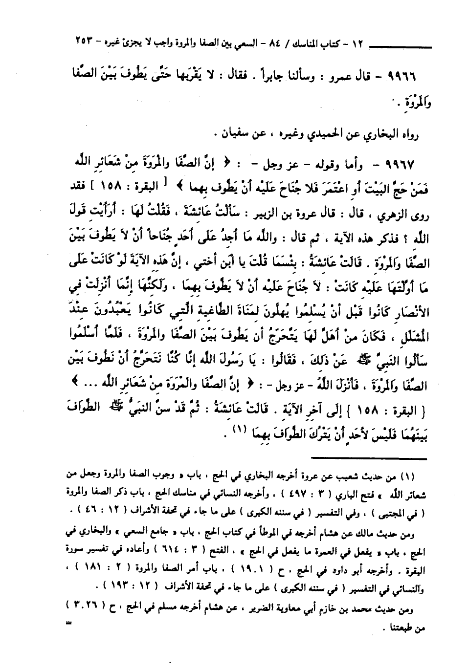 9967 - وَأَمَّا قَوْلُهُ عَزَّ وَجَلَّ: {إِنَّ الصَّفَا وَالْمَرْوَةَ مِنْ شَعَائِرِ اللَّهِ فَمَنْ حَجَّ الْبَيْتَ أَوِ اعْتَمَرَ فَلَا جُنَاحَ عَلَيْهِ أَنْ يَطَّوَّفَ بِهِمَا} [البقرة: 158]، فَقَدْ رَوَى الزُّهْرِيُّ قَالَ: قَالَ عُرْوَةُ بْنُ الزُّبَيْرِ: سَأَلْتُ عَائِشَةَ، فَقُلْتُ لَهَا: أَرَأَيْتِ قَوْلَ اللَّهِ؟ فَذَكَرَ هَذِهِ الْآيَةَ، ثُمَّ قَالَ: وَاللَّهِ مَا أَجِدُ عَلَى أَحَدٍ جُنَاحًا أَنْ لَا يَطُوفَ بَيْنَ الصَّفَا، وَالْمَرْوَةِ قَالَتْ عَائِشَةُ: «بِئْسَمَا قُلْتَ يَا ابْنَ أُخْتِي، إِنَّ هَذِهِ الْآيَةَ لَوْ كَانَتْ عَلَى مَا أَوَّلْتَهَا عَلَيْهِ كَانَتْ، لَا جُنَاحَ عَلَيْهِ أَنْ لَا يَطُوفَ بِهِمَا، وَلَكِنَّهَا إِنَّمَا أُنْزِلَتْ فِي الْأَنْصَارِ كَانُوا قَبْلَ أَنْ يُسْلِمُوا يُهِلُّونَ لِمَنَاةَ الطَّاغِيَةِ الَّتِي كَانُوا يَعْبُدُونَ عِنْدَ الْمُشَلَّلِ، فَكَانَ مَنْ أَهَلَّ لَهَا يَتَحَرَّجُ أَنْ يَطُوفَ بَيْنَ الصَّفَا وَالْمَرْوَةِ»، فَلَمَّا أَسْلَمُوا سَأَلُوا النَّبِيَّ صَلَّى اللهُ عَلَيْهِ وَسَلَّمَ عَنْ ذَلِكَ، فَقَالُوا: يَا رَسُولَ اللَّهِ إِنَّا كُنَّا " §نَتَحَرَّجُ أَنْ نَطُوفَ بَيْنَ الصَّفَا، وَالْمَرْوَةِ، فَأَنْزَلَ اللَّهُ عَزَّ وَجَلَّ: {إِنَّ الصَّفَا وَالْمَرْوَةَ مِنْ شَعَائِرِ اللَّهِ} [البقرة: 158] إِلَى آخِرِ الْآيَةِ. قَالَتْ عَائِشَةُ: ثُمَّ قَدْ سَنَّ النَّبِيُّ صَلَّى اللهُ عَلَيْهِ وَسَلَّمَ الطَّوَافَ بَيْنَهُمَا، فَلَيْسَ لِأَحَدٍ أَنْ يَتْرُكَ الطَّوَافَ بِهِمَا " -[254]- أَخْبَرَنَاهُ أَبُو عَبْدِ اللَّهِ الْحَافِظُ قَالَ: أَخْبَرَنِي أَبُو مُحَمَّدٍ الْمُزَنِيُّ، أَخْبَرَنَا عَلِيُّ بْنُ مُحَمَّدِ بْنِ عِيسَى، حَدَّثَنَا أَبُو الْيَمَانِ قَالَ: أَخْبَرَنِي شُعَيْبٌ، عَنِ الزُّهْرِيِّ، فَذَكَرَهُ رَوَاهُ الْبُخَارِيُّ فِي الصَّحِيحِ، عَنْ أَبِي الْيَمَانِ،