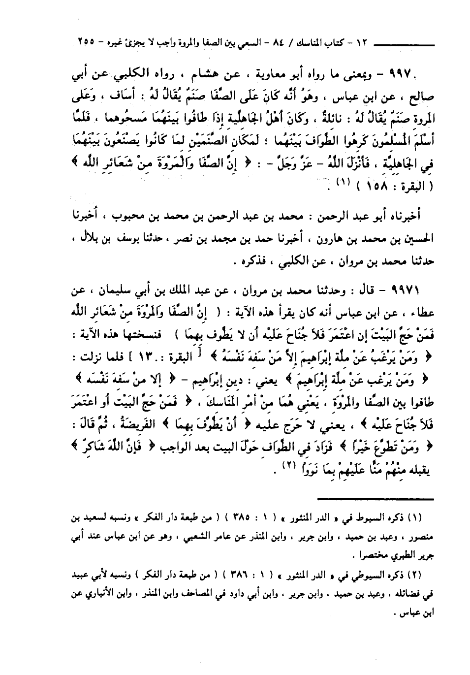 9971 - قَالَ وحَدَّثَنَا مُحَمَّدُ بْنُ مَرْوَانَ، عَنْ عَبْدِ الْمَلِكِ بْنِ أَبِي سُفْيَانَ، عَنْ عَطَاءٍ، عَنِ ابْنِ عَبَّاسٍ، أَنَّهُ كَانَ يَقْرَأُ هَذِهِ الْآيَةَ: " {إِنَّ الصَّفَا، وَالْمَرْوَةَ مِنْ شَعَائِرِ اللَّهِ فَمَنْ حَجَّ الْبَيْتَ أَوِ اعْتَمَرَ فَلَا جُنَاحَ عَلَيْهِ أَنْ لَا يَطَّوَّفَ بِهِمَا}، فَنَسَخَتْهَا هَذِهِ الْآيَةُ: {وَمَنْ يَرْغَبُ عَنْ مِلَّةِ إِبْرَاهِيمَ إِلَّا مَنْ سَفِهَ نَفْسَهُ} [البقرة: 130]، فَلَمَّا نَزَلَتْ: {وَمَنْ يَرْغَبُ عَنْ مِلَّةِ إِبْرَاهِيمَ} [البقرة: 130]، يَعْنِي: دِينَ إِبْرَاهِيمَ، {إِلَّا مَنْ سَفِهَ نَفْسَهُ} [البقرة: 130]، طَافُوا بَيْنَ الصَّفَا، وَالْمَرْوَةِ، يَعْنِي هُمَا مِنْ أَمْرِ الْمَنَاسِكِ، {فَمَنْ حَجَّ الْبَيْتَ أَوِ اعْتَمَرَ، فَلَا جُنَاحَ عَلَيْهِ} [البقرة: 158]، يَعْنِي لَا حَرَجَ عَلَيْهِ، {أَنْ يَطَّوَّفَ بِهِمَا} [البقرة: 158]، الْفَرِيضَةُ، ثُمَّ قَالَ: {وَمَنْ تَطَوَّعَ خَيْرًا} [البقرة: 158]، فَزَادَ فِي الطَّوَافِ حَوْلَ الْبَيْتِ بَعْدَ الْوَاجِبِ، {فَإِنَّ اللَّهَ شَاكِرٌ} [البقرة: 158] يَقْبَلُهُ مَنًّا عَلَيْهِمْ بِمَا نَوَوْا " -[256]-،
