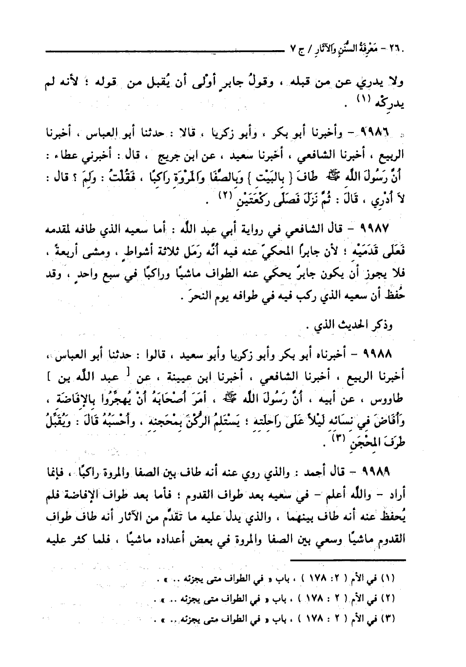 9987 - قَالَ الشَّافِعِيُّ فِي رِوَايَةِ أَبِي عَبْدِ اللَّهِ: أَمَّا سَعْيُهُ الَّذِي طَافَهُ لِمَقْدَمِهِ فَعَلَى قَدَمَيْهِ؛ لِأَنَّ جَابِرًا الْمَحْكِيَّ عَنْهُ فِيهِ أَنَّهُ رَمَلَ ثَلَاثَةَ أَشْوَاطٍ، وَمَشَى أَرْبَعَةً، فَلَا يَجُوزُ أَنْ يَكُونَ جَابِرٌ يَحْكِي عَنْهُ الطَّوَافَ مَاشِيًا وَرَاكِبًا فِي سَبْعٍ وَاحِدٍ، وَقَدْ حُفِظَ أَنَّ سَعْيَهُ الَّذِي رَكِبَ فِيهِ فِي طَوَافِهِ يَوْمَ النَّحْرِ وَذَكَرَ الْحَدِيثَ الَّذِي