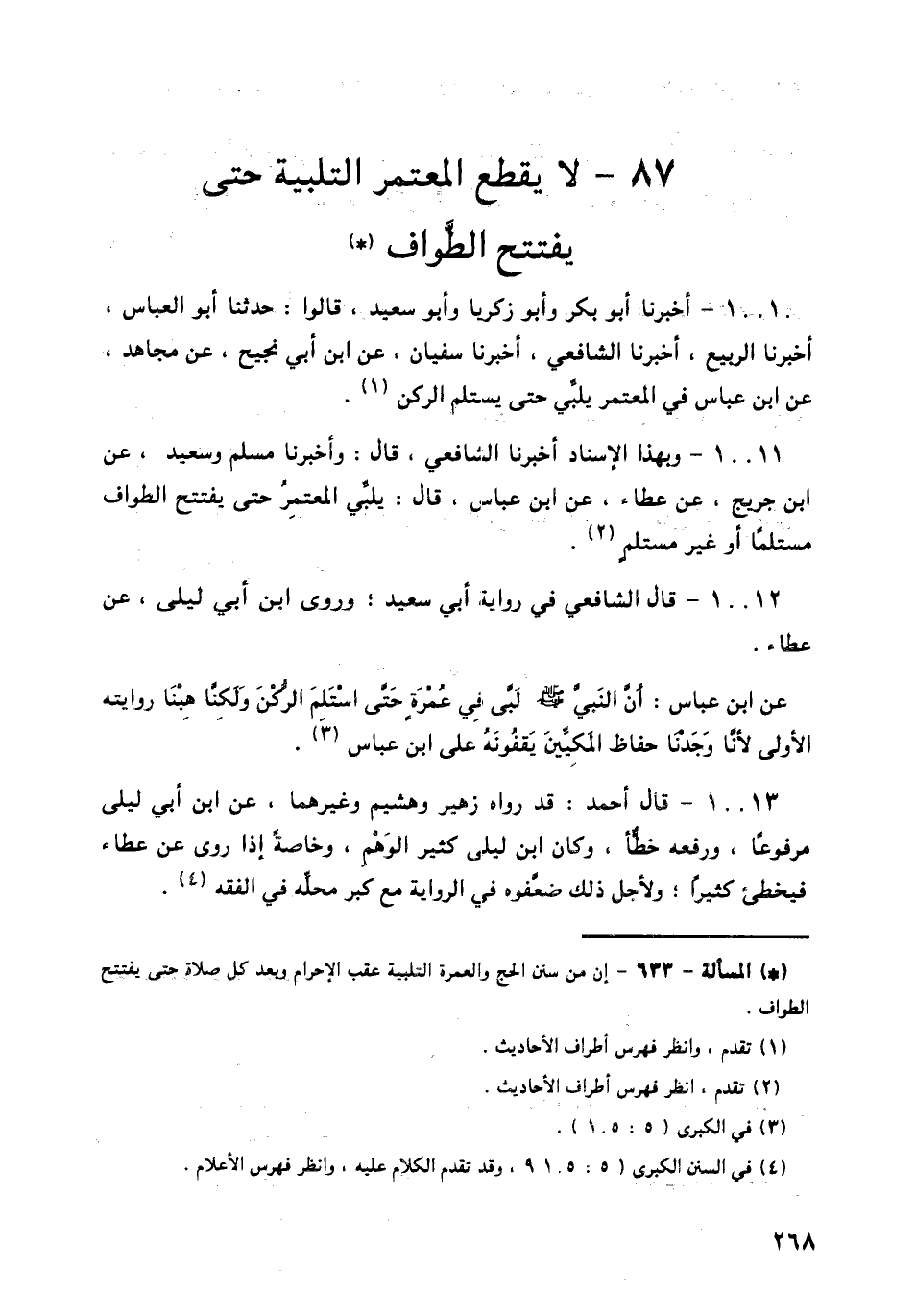 10011 - وَبِهَذَا الْإِسْنَادِ أَخْبَرَنَا الشَّافِعِيُّ قَالَ: وَأَخْبَرَنَا مُسْلِمٌ، وسَعِيدٌ، عَنِ ابْنِ جُرَيْجٍ، عَنْ عَطَاءٍ، عَنِ ابْنِ عَبَّاسٍ قَالَ: § «يُلَبِّي الْمُعْتَمِرُ حَتَّى يَفْتَتِحَ الطَّوَافَ مُسْتَلِمًا أَوْ غَيْرَ مُسْتَلِمٍ»