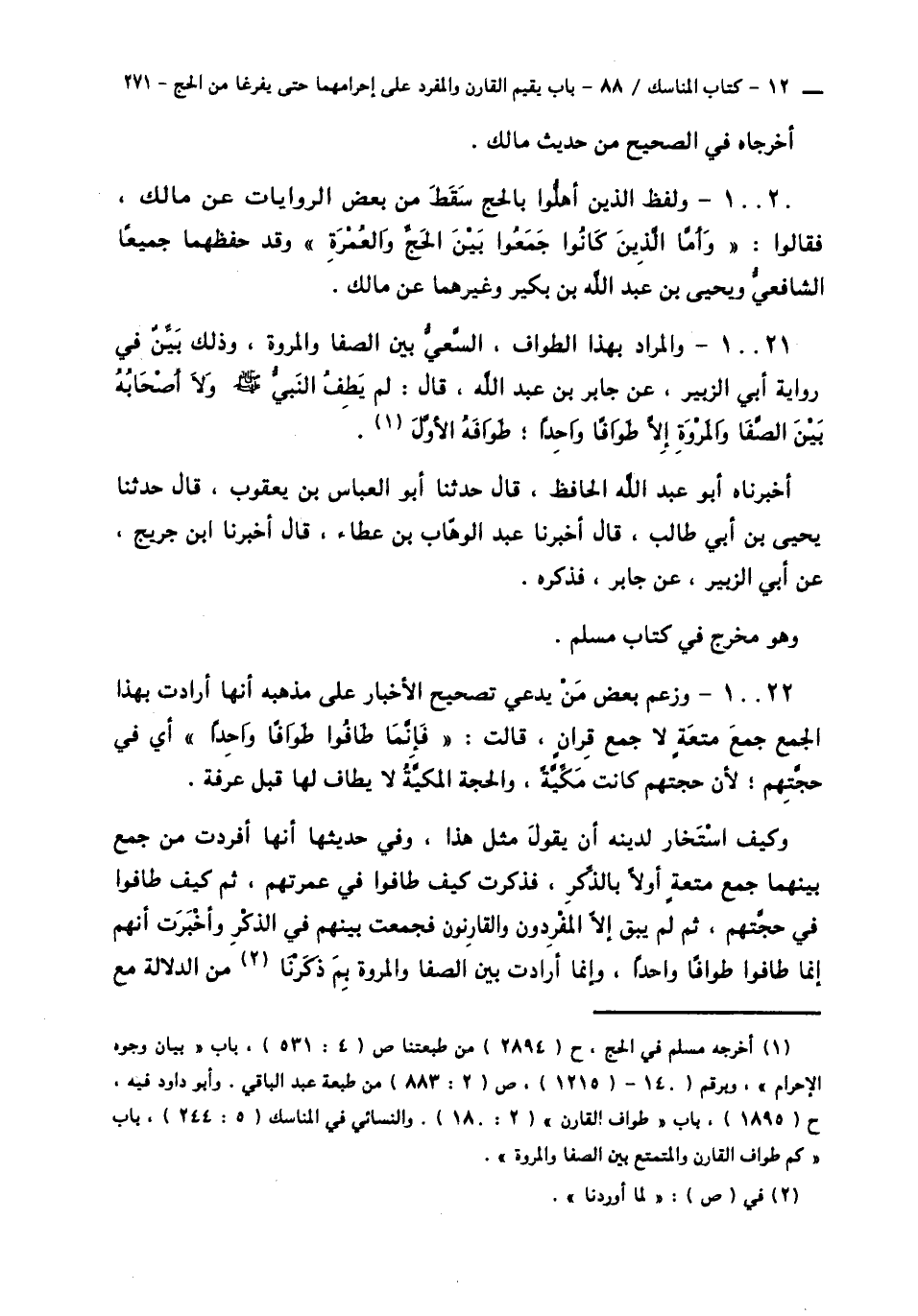 وَذَلِكَ بَيِّنٌ فِي رِوَايَةِ أَبِي الزُّبَيْرِ، عَنْ جَابِرِ بْنِ عَبْدِ اللَّهِ قَالَ: «§لَمْ يَطُفِ النَّبِيُّ صَلَّى اللهُ عَلَيْهِ وَسَلَّمَ، وَلَا أَصْحَابُهُ بَيْنَ الصَّفَا وَالْمَرْوَةِ إِلَّا طَوَافًا وَاحِدًا، طَوَافَهُ الْأَوَّلَ». أَخْبَرَنَاهُ أَبُو عَبْدِ اللَّهِ الْحَافِظُ قَالَ: حَدَّثَنَا أَبُو الْعَبَّاسِ بْنُ يَعْقُوبَ قَالَ: حَدَّثَنَا يَحْيَى بْنُ أَبِي طَالِبٍ قَالَ: أَخْبَرَنَا عَبْدُ الْوَهَّابِ بْنُ عَطَاءٍ قَالَ: أَخْبَرَنَا ابْنُ جُرَيْجٍ، عَنْ أَبِي الزُّبَيْرِ، عَنْ جَابِرٍ، فَذَكَرَهُ وَهُوَ مُخَرَّجٌ فِي كِتَابِ مُسْلِمٍ