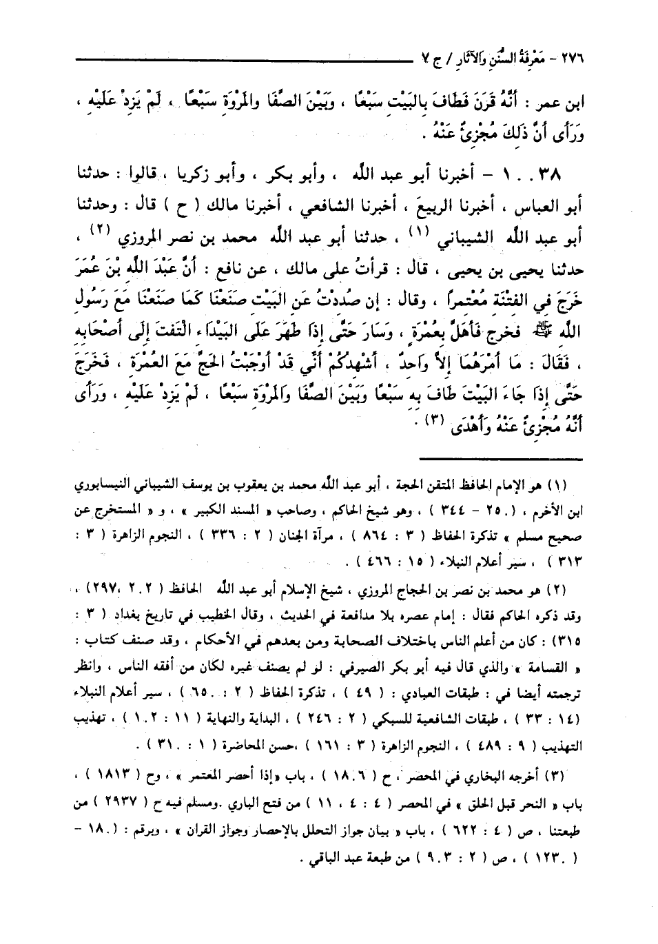 10038 - أَخْبَرَنَا أَبُو عَبْدِ اللَّهِ وَأَبُو بَكْرٍ، وَأَبُو زَكَرِيَّا، قَالُوا: حَدَّثَنَا أَبُو الْعَبَّاسِ، أَخْبَرَنَا الرَّبِيعُ، أَخْبَرَنَا الشَّافِعِيُّ، أَخْبَرَنَا مَالِكٌ، ح قَالَ: وحَدَّثَنَا أَبُو عَبْدِ اللَّهِ الشَّيْبَانِيُّ، حَدَّثَنَا أَبُو عَبْدِ اللَّهِ مُحَمَّدُ بْنُ نَصْرٍ الْمَرْوَزِيُّ، حَدَّثَنَا يَحْيَى بْنُ يَحْيَى قَالَ: قَرَأْتُ عَلَى مَالِكٍ، عَنْ نَافِعٍ: أَنَّ عَبْدَ اللَّهِ بْنَ عُمَرَ، خَرَجَ فِي الْفِتْنَةِ مُعْتَمِرًا، وَقَالَ: إِنْ صُدِدْتُ عَنِ الْبَيْتِ، صَنَعْنَا كَمَا صَنَعْنَا مَعَ رَسُولِ اللَّهِ صَلَّى اللهُ عَلَيْهِ وَسَلَّمَ، فَخَرَجَ فَأَهَلَّ بِعُمْرَةٍ، وَسَارَ حَتَّى إِذَا ظَهَرَ عَلَى الْبَيْدَاءِ الْتَفَتَ إِلَى أَصْحَابِهِ، فَقَالَ: مَا أَمْرُهُمَا إِلَّا وَاحِدٌ، أُشْهِدُكُمْ أَنِّي قَدْ أَوْجَبْتُ الْحَجَّ مَعَ الْعُمْرَةِ، فَخَرَجَ حَتَّى §إِذَا جَاءَ الْبَيْتَ طَافَ بِهِ سَبْعًا، وَبَيْنَ الصَّفَا وَالْمَرْوَةِ سَبْعًا، لَمْ يَزِدْ عَلَيْهِ، وَرَأَى أَنَّهُ مُجْزِئٌ عَنْهُ وَأَهْدَى " -[277]-. لَفْظُ حَدِيثِ يَحْيَى بْنِ يَحْيَى، وَرَوَاهُ مُسْلِمٌ فِي الصَّحِيحِ، عَنْ يَحْيَى بْنِ يَحْيَى