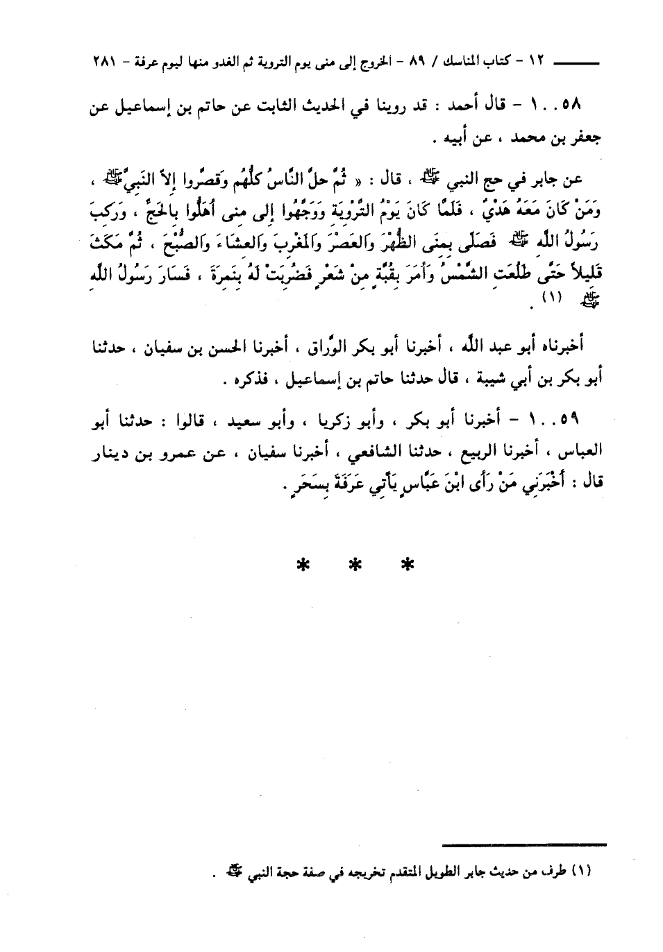 10058 - قَالَ أَحْمَدُ: قَدْ رُوِّينَا فِي الْحَدِيثِ الثَّابِتِ، عَنْ حَاتِمِ بْنِ إِسْمَاعِيلَ، عَنْ جَعْفَرِ بْنِ مُحَمَّدٍ، عَنْ أَبِيهِ، عَنْ جَابِرٍ فِي حَجِّ النَّبِيِّ صَلَّى اللهُ عَلَيْهِ وَسَلَّمَ قَالَ: ثُمَّ حَلَّ النَّاسُ كُلُّهُمْ وَقَصَّرُوا إِلَّا النَّبِيَّ صَلَّى اللهُ عَلَيْهِ وَسَلَّمَ وَمَنْ كَانَ مَعَهُ هَدْيٌ، فَلَمَّا كَانَ يَوْمُ التَّرْوِيَةِ، وَوَجَّهُوا إِلَى مِنًى أَهَلُّوا بِالْحَجِّ، § «وَرَكِبَ رَسُولُ اللَّهِ صَلَّى اللهُ عَلَيْهِ وَسَلَّمَ فَصَلَّى بِمِنًى الظُّهْرَ وَالْعَصْرَ وَالْمَغْرِبَ وَالْعِشَاءَ وَالصُّبْحَ، ثُمَّ مَكَثَ قَلِيلًا حَتَّى طَلَعَتِ الشَّمْسُ، وَأَمَرَ بِقُبَّةٍ مِنْ شَعَرٍ فَضُرِبَتْ لَهُ بِنَمِرَةَ، فَسَارَ رَسُولُ اللَّهِ صَلَّى اللهُ عَلَيْهِ وَسَلَّمَ» أَخْبَرَنَاهُ أَبُو عَبْدِ اللَّهِ، أَخْبَرَنَا أَبُو بَكْرٍ الْوَرَّاقُ، أَخْبَرَنَا الْحَسَنُ بْنُ سُفْيَانَ، حَدَّثَنَا أَبُو بَكْرِ بْنُ أَبِي شَيْبَةَ قَالَ: حَدَّثَنَا حَاتِمُ بْنُ إِسْمَاعِيلَ، فَذَكَرَهُ