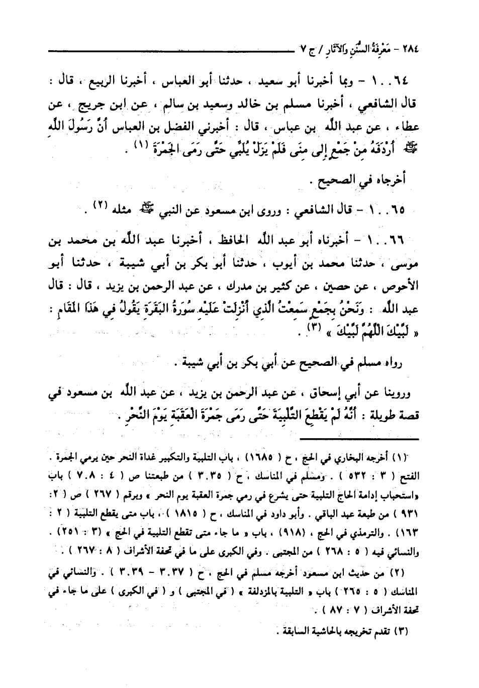 10066 - أَخْبَرَنَاهُ أَبُو عَبْدِ اللَّهِ الْحَافِظُ، أَخْبَرَنَا عَبْدُ اللَّهِ بْنُ مُحَمَّدِ بْنِ مُوسَى، حَدَّثَنَا مُحَمَّدُ بْنُ أَيُّوبَ، حَدَّثَنَا أَبُو بَكْرِ بْنُ أَبِي شَيْبَةَ، حَدَّثَنَا أَبُو الْأَحْوَصِ، عَنْ حُصَيْنٍ، عَنْ كَثِيرِ بْنِ مُدْرِكٍ، عَنْ عَبْدِ الرَّحْمَنِ بْنِ يَزِيدَ قَالَ: قَالَ عَبْدُ اللَّهِ: «وَنَحْنُ بِجَمْعٍ §سَمِعْتُ الَّذِيَ أُنْزِلَتْ عَلَيْهِ سُورَةُ الْبَقَرَةِ، يَقُولُ فِي هَذَا الْمَقَامِ» لَبَّيْكَ اللَّهُمَّ لَبَّيْكَ ". رَوَاهُ مُسْلِمٌ فِي الصَّحِيحِ، عَنْ أَبِي بَكْرِ بْنِ أَبِي شَيْبَةَ وَرُوِّينَا عَنْ أَبِي إِسْحَاقَ، عَنْ عَبْدِ الرَّحْمَنِ بْنِ يَزِيدَ، عَنْ عَبْدِ اللَّهِ بْنِ مَسْعُودٍ فِي قِصَّةٍ طَوِيلَةٍ: «أَنَّهُ لَمْ يَقْطَعِ التَّلْبِيَةَ حَتَّى رَمَى جَمْرَةَ الْعَقَبَةِ يَوْمَ النَّحْرِ»