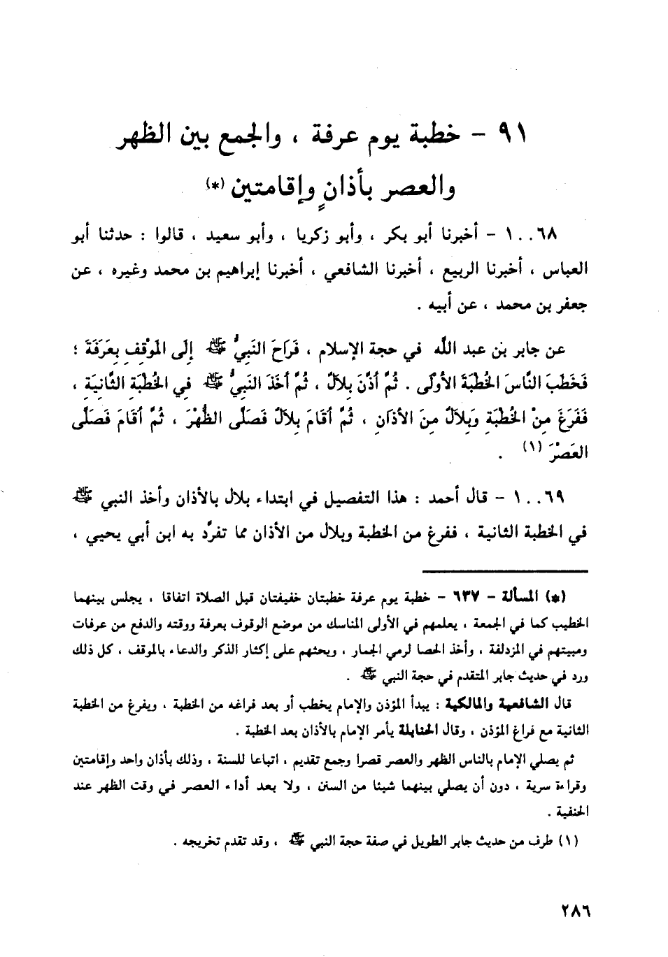 10068 - أَخْبَرَنَا أَبُو بَكْرٍ، وَأَبُو زَكَرِيَّا، وَأَبُو سَعِيدٍ، قَالُوا: حَدَّثَنَا أَبُو الْعَبَّاسِ، أَخْبَرَنَا الرَّبِيعُ، أَخْبَرَنَا الشَّافِعِيُّ، أَخْبَرَنَا إِبْرَاهِيمُ بْنُ مُحَمَّدٍ، وَغَيْرُهُ، عَنْ جَعْفَرِ بْنِ مُحَمَّدٍ، عَنْ أَبِيهِ، عَنْ جَابِرِ بْنِ عَبْدِ اللَّهِ فِي حَجَّةِ الْإِسْلَامِ: «فَرَاحَ النَّبِيُّ صَلَّى اللهُ عَلَيْهِ وَسَلَّمَ إِلَى الْمَوْقِفِ بِعَرَفَةَ §فَخَطَبَ النَّاسَ الْخُطْبَةَ الْأُولَى، ثُمَّ أَذَّنَ بِلَالٌ، ثُمَّ أَخَذَ النَّبِيُّ صَلَّى اللهُ عَلَيْهِ وَسَلَّمَ فِي الْخُطْبَةِ الثَّانِيَةِ، فَفَرَغَ مِنَ الْخُطْبَةِ وَبِلَالٌ مِنَ الْأَذَانِ، ثُمَّ أَقَامَ بِلَالٌ فَصَلَّى الظُّهْرَ، ثُمَّ أَقَامَ فَصَلَّى الْعَصْرَ»