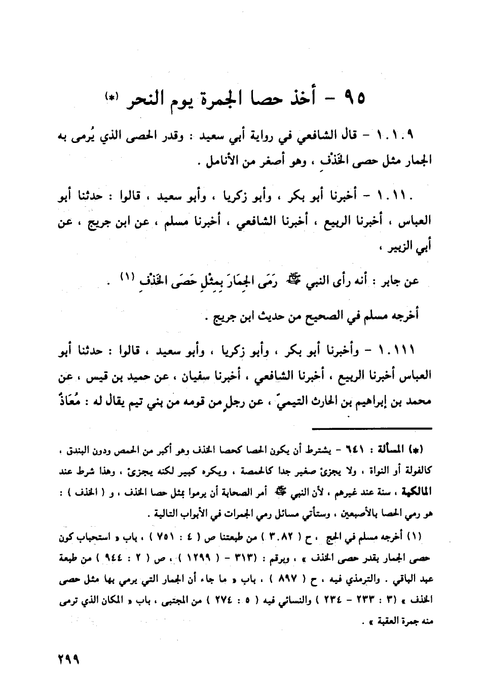 10109 - قَالَ الشَّافِعِيُّ فِي رِوَايَةِ أَبِي سَعِيدٍ: وَقَدْرُ الْحَصَى الَّذِي يُرْمَى بِهِ الْجِمَارُ مِثْلُ حَصَى الْخَذْفِ، وَهُوَ أَصْغَرُ مِنَ الْأَنَامِلِ
