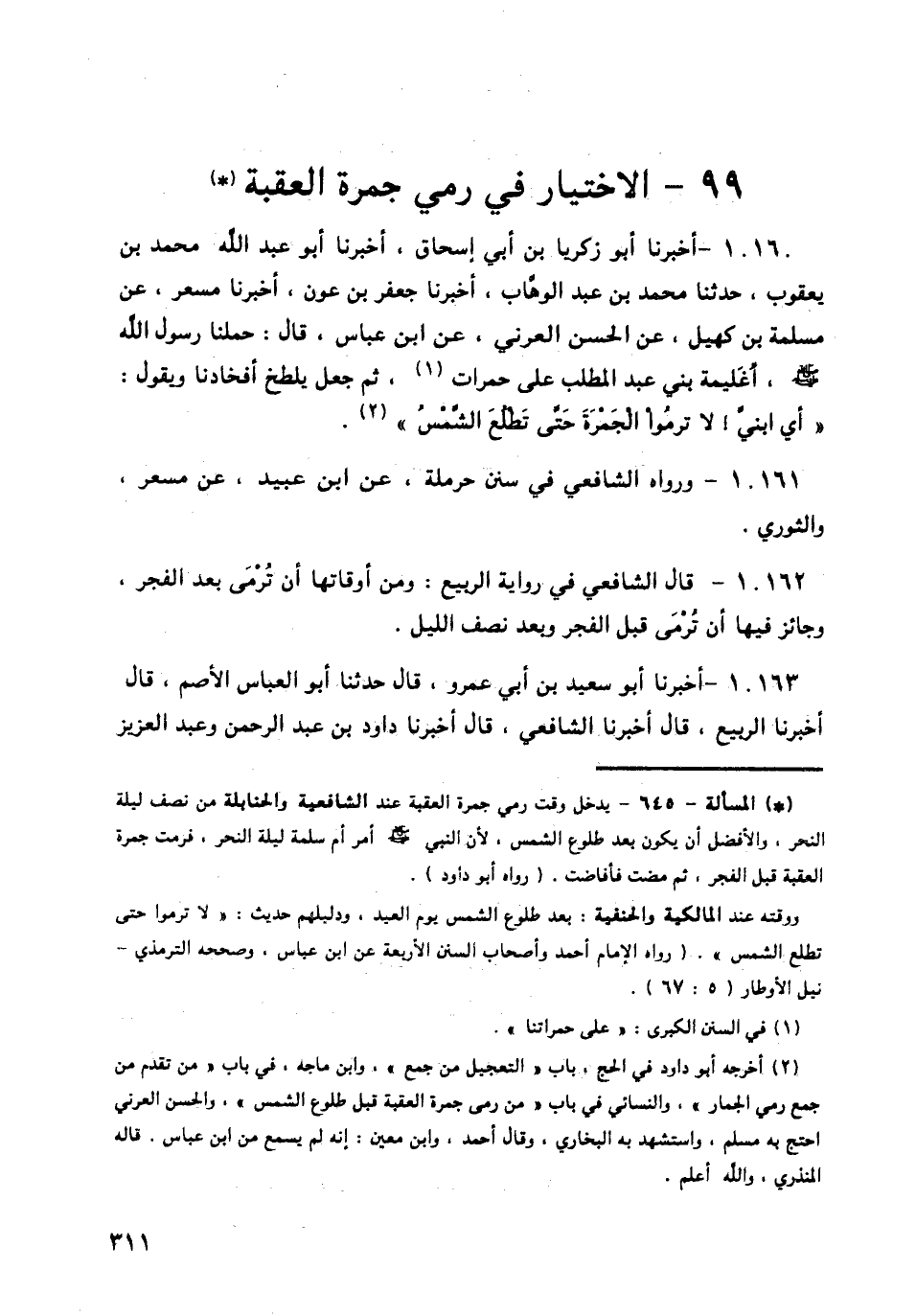 10163 - أَخْبَرَنَا أَبُو سَعِيدِ بْنُ أَبِي عَمْرٍو قَالَ: حَدَّثَنَا أَبُو الْعَبَّاسِ الْأَصَمُّ قَالَ: أَخْبَرَنَا الرَّبِيعُ قَالَ: أَخْبَرَنَا الشَّافِعِيُّ قَالَ: أَخْبَرَنَا دَاوُدُ بْنُ عَبْدِ الرَّحْمَنِ، وَعَبْدُ الْعَزِيزِ -[312]- بْنُ مُحَمَّدٍ الدَّرَاوَرْدِيُّ، عَنْ هِشَامٍ، عَنْ أَبِيهِ قَالَ: «دَارَ رَسُولُ اللَّهِ صَلَّى اللهُ عَلَيْهِ وَسَلَّمَ إِلَى أُمِّ سَلَمَةَ يَوْمَ النَّحْرِ، §فَأَمَرَهَا أَنْ تُعَجِّلَ الْإِفَاضَةَ مِنْ جَمْعٍ، حَتَّى تَرْمِيَ الْجَمْرَةَ، وَتُوَافِيَ صَلَاةَ الصُّبْحِ بِمَكَّةَ، وَكَانَ يَوْمَهَا، فَأَحَبَّ أَنْ يُوَافِقَهُ، أَوْ تُوَافِيَهُ»