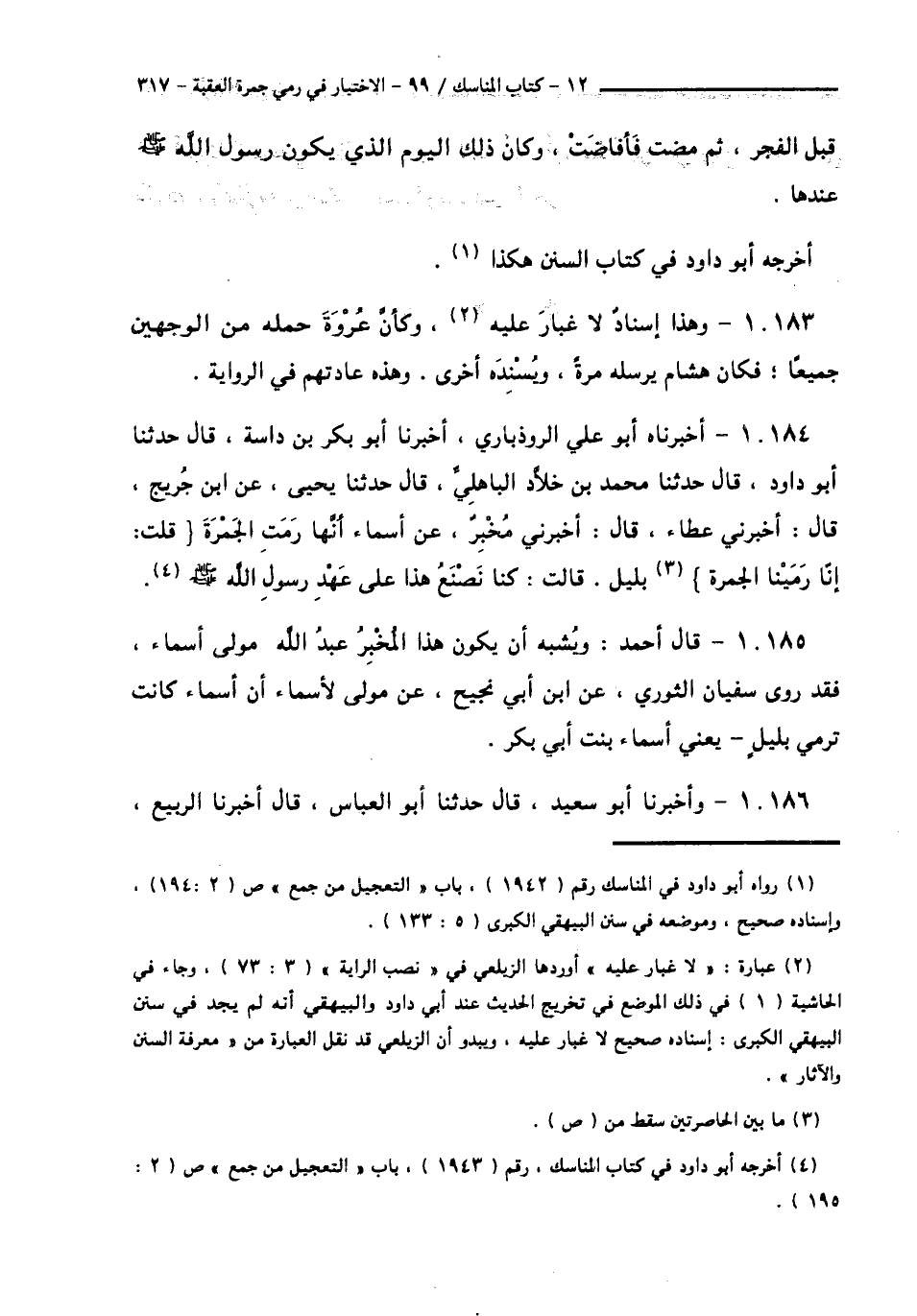 10184 - أَخْبَرَنَاهُ أَبُو عَلِيٍّ الرُّوذْبَارِيُّ، أَخْبَرَنَا أَبُو بَكْرِ بْنُ دَاسَةَ قَالَ: حَدَّثَنَا أَبُو دَاوُدَ قَالَ: حَدَّثَنَا مُحَمَّدُ بْنُ خَلَّادٍ الْبَاهِلِيُّ قَالَ: حَدَّثَنَا يَحْيَى، عَنِ ابْنِ جُرَيْجٍ قَالَ: أَخْبَرَنِي عَطَاءٌ قَالَ: أَخْبَرَنِي مُخْبِرٌ، عَنْ أَسْمَاءَ، أَنَّهَا رَمَتِ الْجَمْرَةَ، قُلْتُ: إِنَّا §رَمَيْنَا الْجَمْرَةَ بِلَيْلٍ ". قَالَتْ: «كُنَّا نَصْنَعُ هَذَا عَلَى عَهْدِ رَسُولِ اللَّهِ صَلَّى اللهُ عَلَيْهِ وَسَلَّمَ»