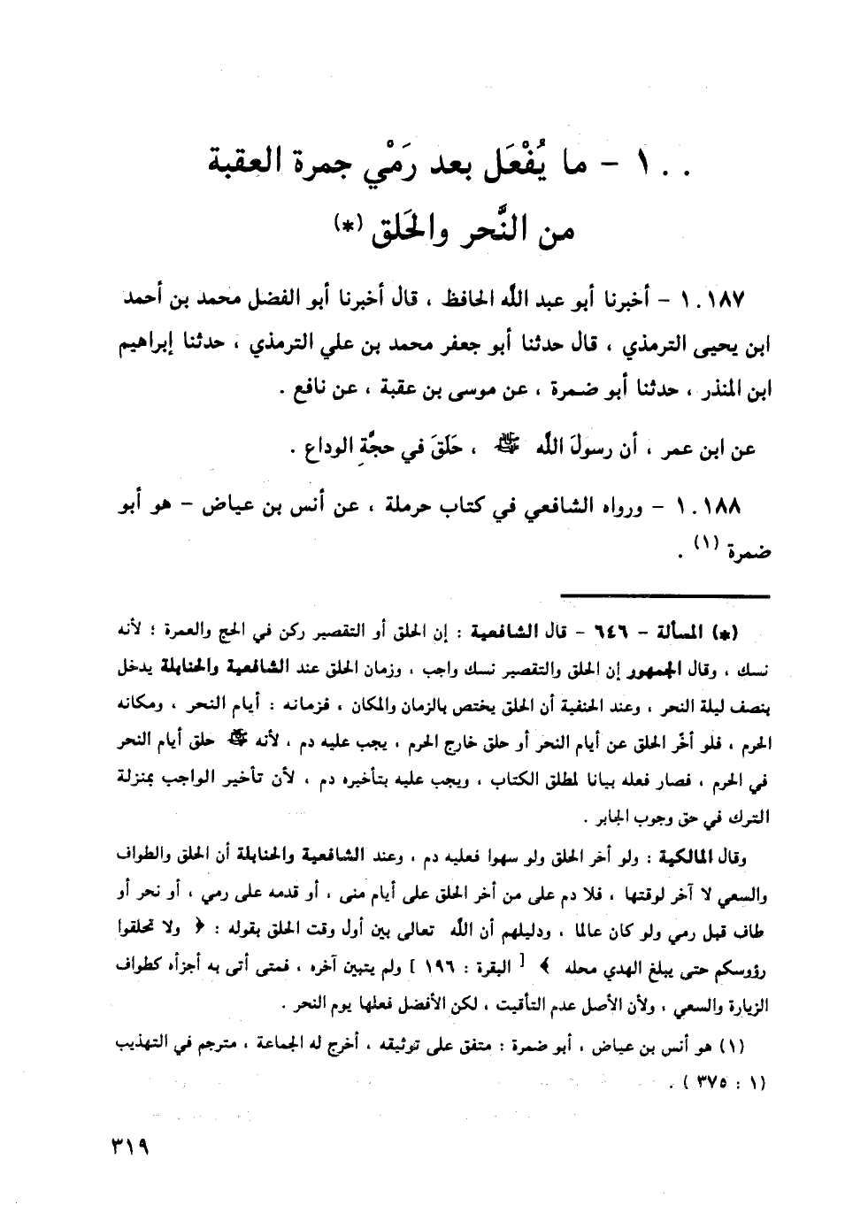 10187 - أَخْبَرَنَا أَبُو عَبْدِ اللَّهِ الْحَافِظُ قَالَ: أَخْبَرَنَا أَبُو الْفَضْلِ مُحَمَّدُ بْنُ أَحْمَدَ بْنِ يَحْيَى التِّرْمِذِيُّ قَالَ: حَدَّثَنَا أَبُو جَعْفَرٍ مُحَمَّدُ بْنُ عَلِيٍّ التِّرْمِذِيُّ، حَدَّثَنَا إِبْرَاهِيمُ بْنُ الْمُنْذِرِ، حَدَّثَنَا أَبُو ضَمْرَةَ، عَنْ مُوسَى بْنِ عُقْبَةَ، عَنْ نَافِعٍ، عَنِ ابْنِ عُمَرَ: «أَنَّ رَسُولَ اللَّهِ صَلَّى اللهُ عَلَيْهِ وَسَلَّمَ §حَلَقَ فِي حَجَّةِ الْوَدَاعِ»،
