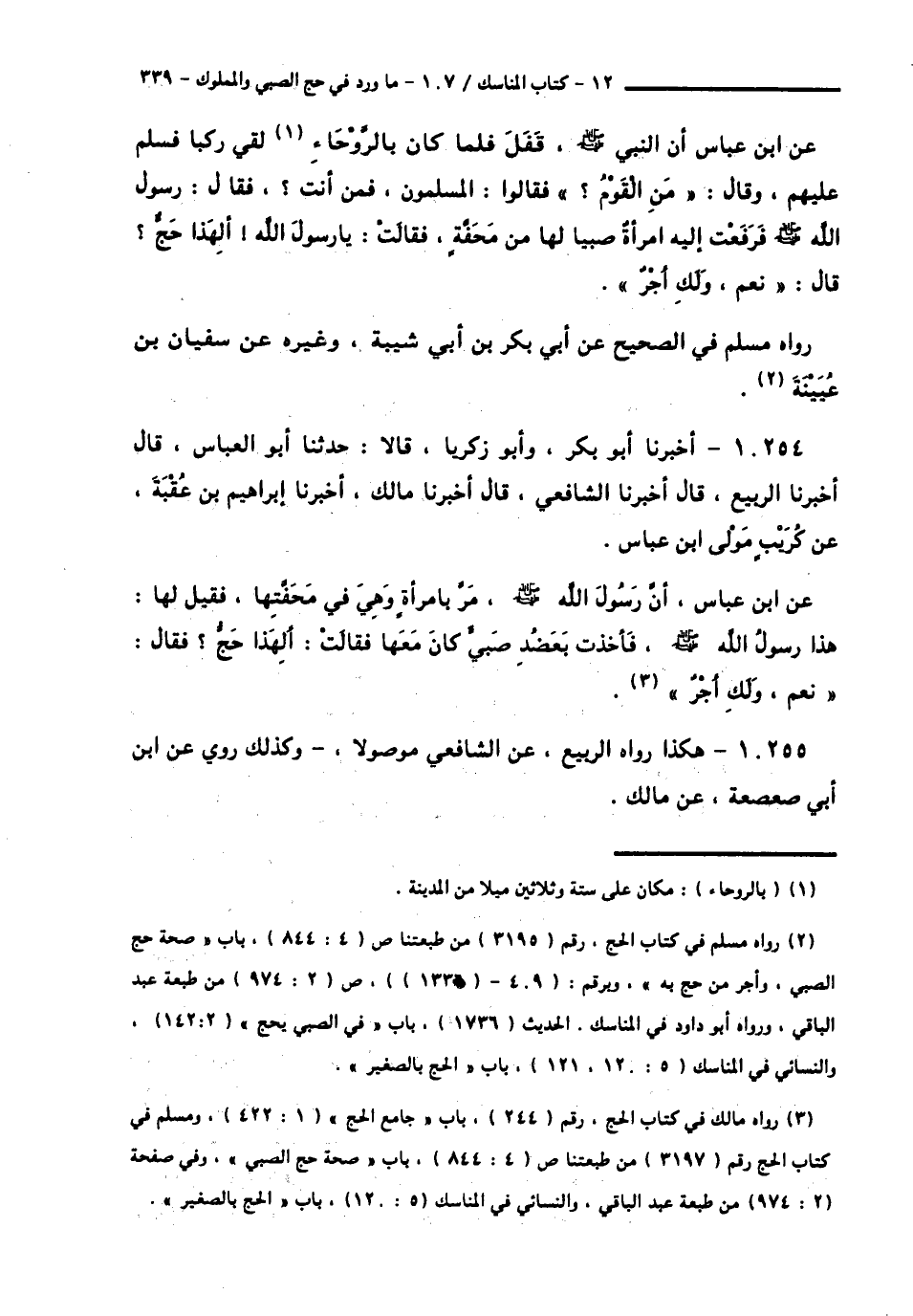 10254 - أَخْبَرَنَا أَبُو بَكْرٍ، وَأَبُو زَكَرِيَّا، قَالَا: حَدَّثَنَا أَبُو الْعَبَّاسِ قَالَ: أَخْبَرَنَا الرَّبِيعُ قَالَ: أَخْبَرَنَا الشَّافِعِيُّ قَالَ: أَخْبَرَنَا مَالِكٌ، أَخْبَرَنَا إِبْرَاهِيمُ بْنُ عُقْبَةَ، عَنْ كُرَيْبٍ، مَوْلَى ابْنِ عَبَّاسٍ، عَنِ ابْنِ عَبَّاسٍ، أَنَّ رَسُولَ اللَّهِ صَلَّى اللهُ عَلَيْهِ وَسَلَّمَ، مَرَّ بِامْرَأَةٍ وَهِيَ فِي مِحَفَّتِهَا، فَقِيلَ لَهَا هَذَا رَسُولُ اللَّهِ صَلَّى اللهُ عَلَيْهِ وَسَلَّمَ، فَأَخَذَتْ بِعَضُدِ §صَبِيٍّ كَانَ مَعَهَا، فَقَالَتْ: أَلِهَذَا حَجٌّ؟ فَقَالَ: «نَعَمْ، وَلَكِ أَجْرٌ»