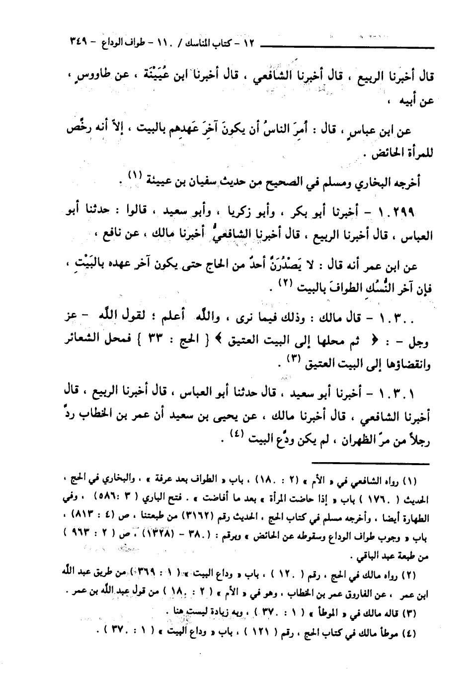 10299 - أَخْبَرَنَا أَبُو بَكْرٍ، وَأَبُو زَكَرِيَّا، وَأَبُو سَعِيدٍ، قَالُوا: حَدَّثَنَا أَبُو الْعَبَّاسِ قَالَ: أَخْبَرَنَا الرَّبِيعُ قَالَ: أَخْبَرَنَا الشَّافِعِيُّ، أَخْبَرَنَا مَالِكٌ، عَنْ نَافِعٍ، عَنِ ابْنِ عُمَرَ، أَنَّهُ قَالَ: «لَا يَصْدُرَنَّ أَحَدٌ مِنَ الْحَاجِّ حَتَّى يَكُونَ آخِرَ عَهْدِهِ بِالْبَيْتِ، فَإِنَّ §آخِرَ النُّسُكِ الطَّوَافُ بِالْبَيْتِ»