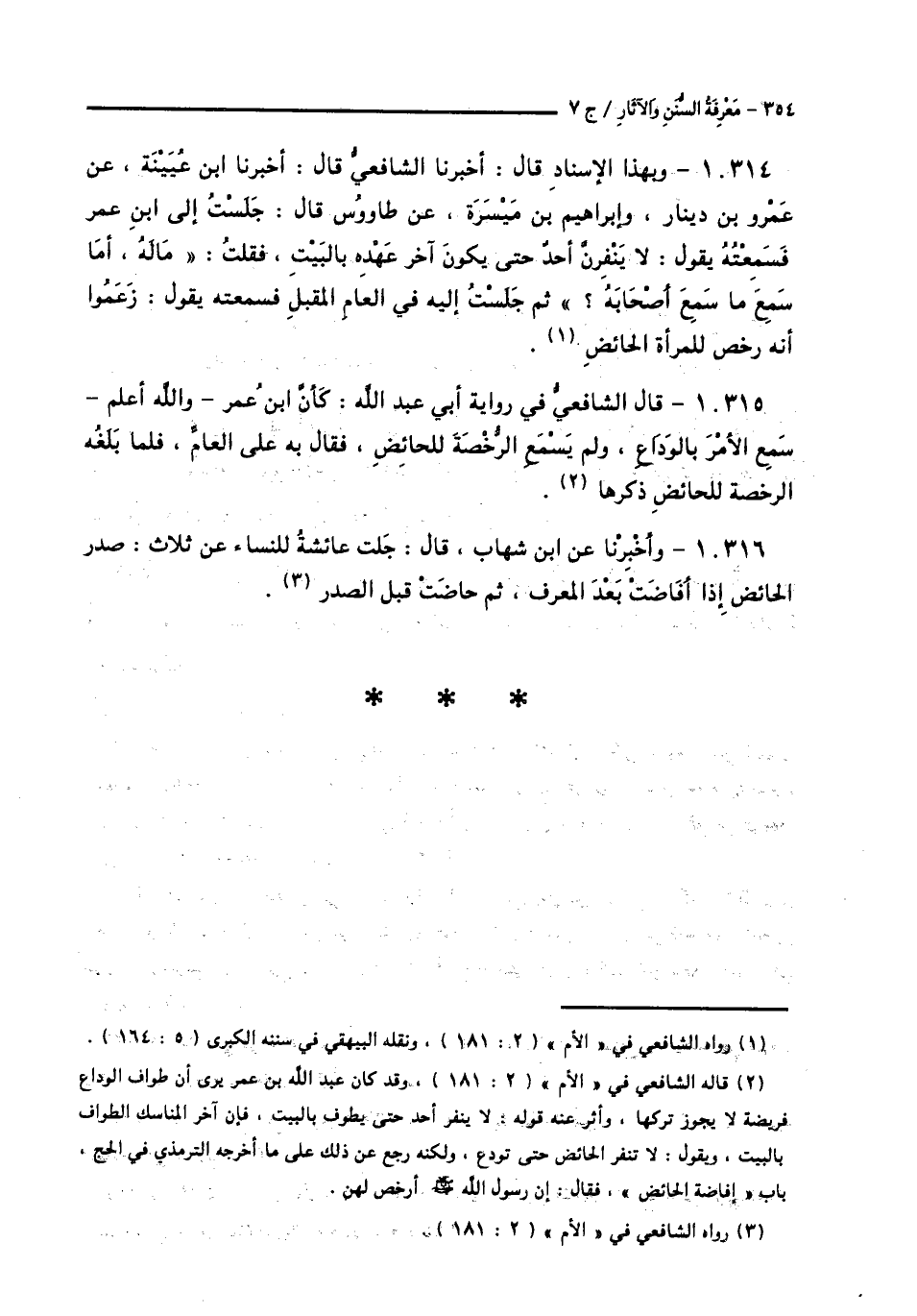 10314 - وَبِهَذَا الْإِسْنَادِ قَالَ: أَخْبَرَنَا الشَّافِعِيُّ قَالَ: أَخْبَرَنَا ابْنُ عُيَيْنَةَ، عَنْ عَمْرِو بْنِ دِينَارٍ، وإِبْرَاهِيمَ بْنِ مَيْسَرَةَ، عَنْ طَاوُسٍ قَالَ: جَلَسْتُ إِلَى ابْنِ عُمَرَ فَسَمِعْتُهُ، يَقُولُ: «§لَا يَنْفِرَنَّ أَحَدٌ حَتَّى يَكُونَ آخِرُ عَهْدِهِ بِالْبَيْتِ»، فَقُلْتُ: مَا لَهُ، أَمَا سَمِعَ مَا سَمِعَ أَصْحَابُهُ؟ "، ثُمَّ جَلَسْتُ إِلَيْهِ فِي الْعَامِ الْمُقْبِلِ فَسَمِعْتُهُ يَقُولُ: زَعَمُوا أَنَّهُ رَخَّصَ لِلْمَرْأَةِ الْحَائِضِ