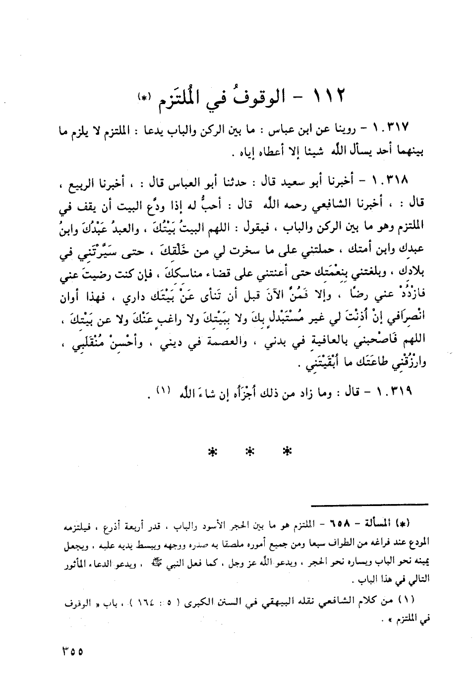 10317 - رُوِّينَا عَنِ ابْنِ عَبَّاسٍ: مَا بَيْنَ الرُّكْنِ وَالْبَابِ يُدْعَى الْمُلْتَزَمُ: لَا يَلْزَمُ مَا بَيْنَهُمَا أَحَدٌ، يَسْأَلُ اللَّهَ شَيْئًا إِلَّا أَعْطَاهُ إِيَّاهُ