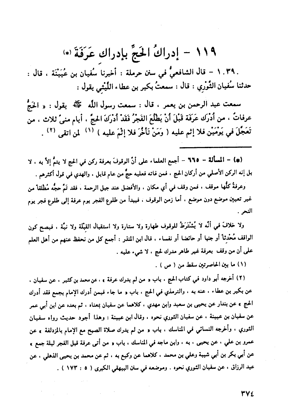10390 - قَالَ الشَّافِعِيُّ فِي سُنَنِ حَرْمَلَةَ: أَخْبَرَنَا سُفْيَانُ بْنُ عُيَيْنَةَ قَالَ: حَدَّثَنَا سُفْيَانُ الثَّوْرِيُّ: قَالَ: سَمِعْتُ بُكَيْرَ بْنَ عَطَاءٍ اللَّيْثِيَّ، يَقُولُ: سَمِعْتُ عَبْدَ الرَّحْمَنِ بْنَ يَعْمُرَ قَالَ: سَمِعْتُ رَسُولَ اللَّهِ صَلَّى اللهُ عَلَيْهِ وَسَلَّمَ، يَقُولُ: «الْحَجُّ عَرَفَاتٌ، مَنْ أَدْرَكَ عَرَفَةَ قَبْلَ أَنْ يَطْلُعَ الْفَجْرُ فَقَدْ أَدْرَكَ الْحَجَّ، أَيَّامُ مِنًى ثَلَاثٌ، مَنْ تَعَجَّلَ فِي يَوْمَيْنِ فَلَا إِثْمَ عَلَيْهِ، وَمَنْ تَأَخَّرَ فَلَا إِثْمَ عَلَيْهِ لِمَنِ اتَّقَى»