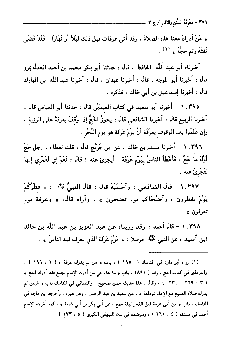 10395 - أَخْبَرَنَا أَبُو سَعِيدٍ فِي كِتَابِ الْعِيدَيْنِ قَالَ: حَدَّثَنَا أَبُو الْعَبَّاسِ قَالَ: أَخْبَرَنَا الرَّبِيعُ قَالَ: أَخْبَرَنَا الشَّافِعِيُّ قَالَ: «§يَجُوزُ الْحَجُّ إِذَا وَقَفَ بِعَرَفَةَ عَلَى الرُّؤْيَةِ، وَإِنْ عَلِمُوا بَعْدَ الْوقُوفِ بِعَرَفَةَ أَنَّ يَوْمَ عَرَفَةَ هُوَ يَوْمُ النَّحْرِ»