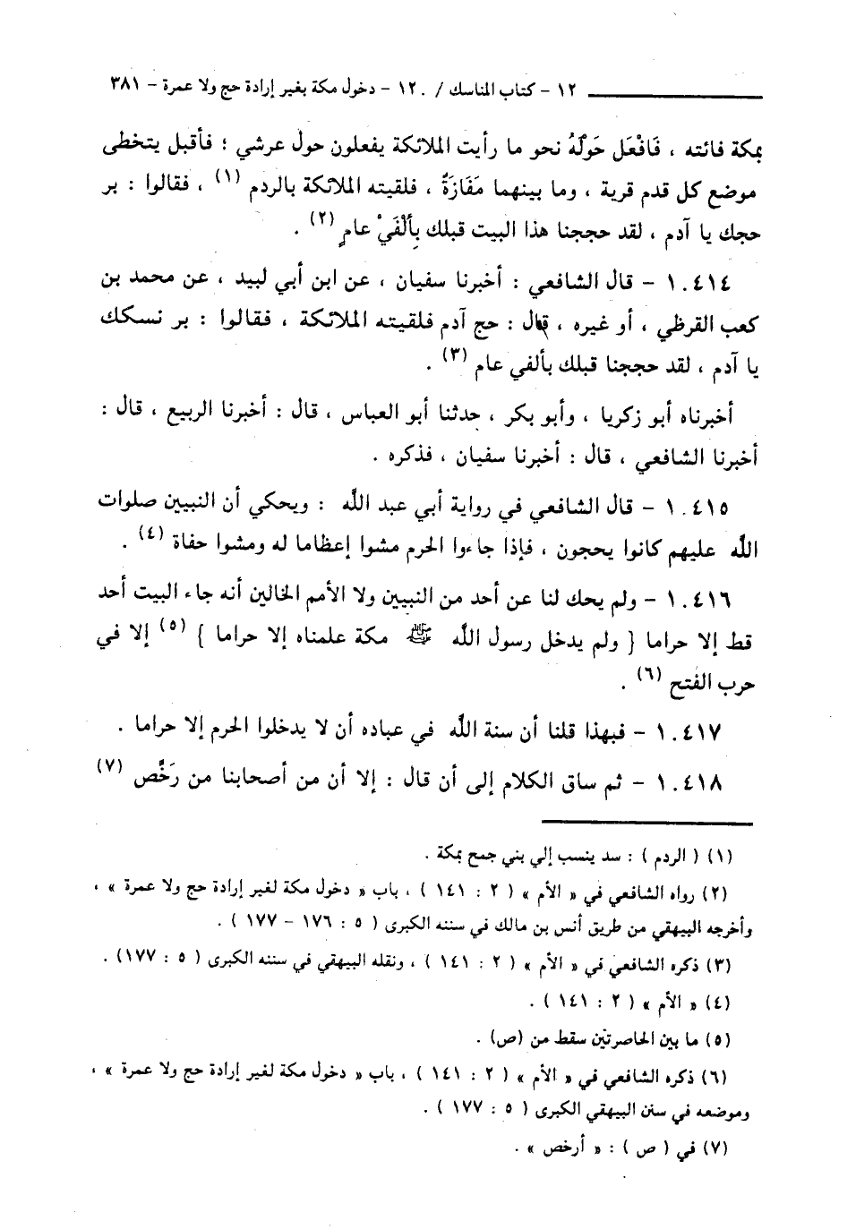 10415 - قَالَ الشَّافِعِيُّ فِي رِوَايَةِ أَبِي عَبْدِ اللَّهِ: وَيُحْكَى أَنَّ النَّبِيِّينَ صَلَوَاتُ اللَّهِ عَلَيْهِمْ كَانُوا يَحُجُّونَ، فَإِذَا جَاءُوا الْحَرَمَ مَشَوْا إِعْظَامًا لَهُ، وَمَشَوْا حُفَاةً،