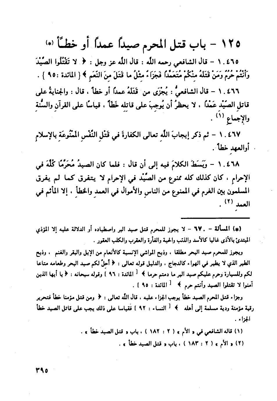 10465 - قَالَ الشَّافِعِيُّ رَحِمَهُ اللَّهُ: قَالَ اللَّهُ عَزَّ وَجَلَّ: {لَا تَقْتُلُوا الصَّيْدَ وَأَنْتُمْ حُرُمٌ وَمَنْ قَتَلَهُ مِنْكُمْ مُتَعَمِّدًا فَجَزَاءٌ مِثْلُ مَا قَتَلَ مِنَ النَّعَمِ} [المائدة: 95]