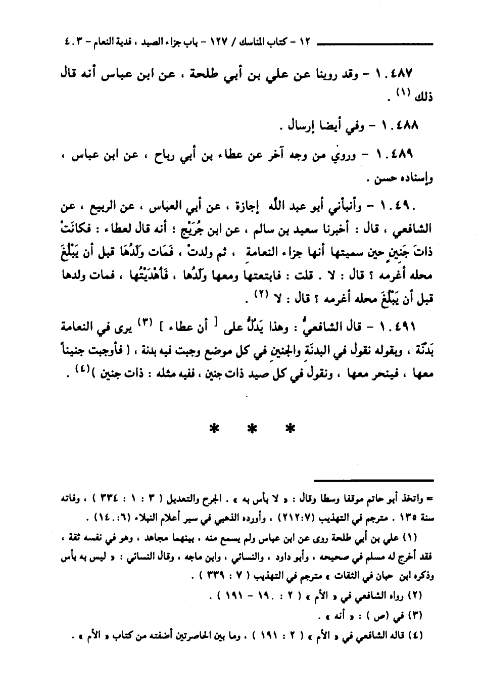 10491 - قَالَ الشَّافِعِيُّ: وَهَذَا يَدُلُّ عَلَى أَنَّ عَطَاءً يَرَى فِي النَّعَامَةِ بَدَنَةً، وَبِقَوْلِهِ نَقُولُ فِي الْبَدَنَةِ، وَالْجَنِينِ فِي كُلِّ مَوْضِعٍ وَجَبَتْ فِيهِ بَدَنَةٌ، فَأَوْجَبَتْ جَنِينًا مَعَهَا، فَيُنْحَرُ مَعَهَا، وَنَقُولُ فِي كُلِّ صَيْدٍ ذَاتِ جَنِينٍ، فَفِيهِ مِثْلُهُ: ذَاتُ جَنِينٍ