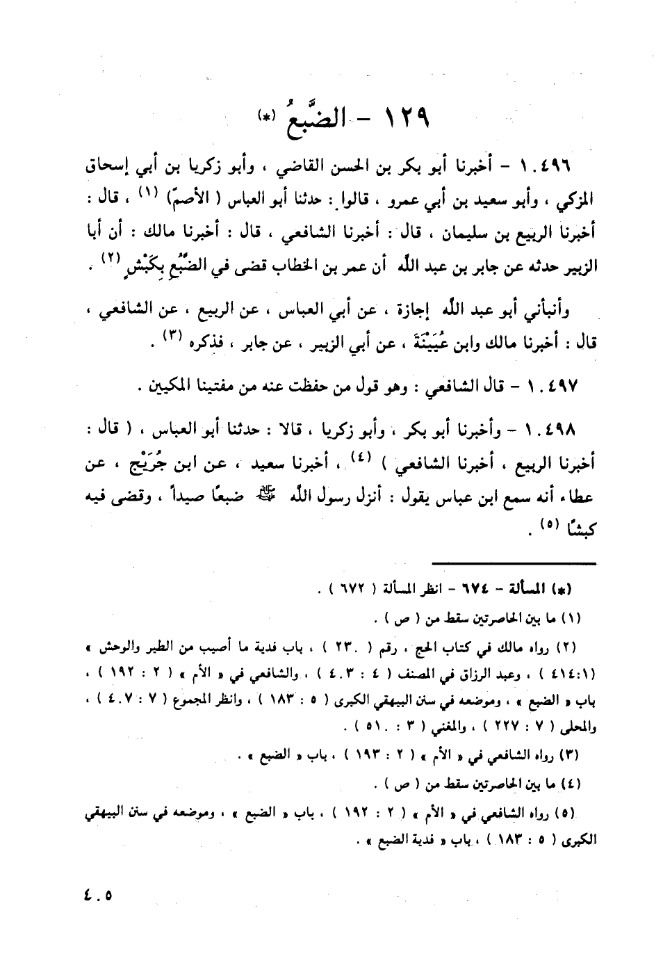 10496 - أَخْبَرَنَا أَبُو بَكْرِ بْنُ الْحَسَنِ الْقَاضِي، وَأَبُو زَكَرِيَّا بْنُ أَبِي إِسْحَاقَ الْمُزَكِّي، وَأَبُو سَعِيدِ بْنُ أَبِي عَمْرٍو، قَالُوا: حَدَّثَنَا أَبُو الْعَبَّاسِ الْأَصَمُّ قَالَ: أَخْبَرَنَا الرَّبِيعُ بْنُ سُلَيْمَانَ قَالَ: أَخْبَرَنَا الشَّافِعِيُّ، قَالَ: أَخْبَرَنَا مَالِكٌ، أَنَّ أَبَا الزُّبَيْرِ حَدَّثَهُ، عَنْ جَابِرِ بْنِ عَبْدِ اللَّهِ: «أَنَّ عُمَرَ بْنَ الْخَطَّابِ، §قَضَى فِي الضَّبُعِ بِكَبْشٍ»، وأَنْبَأَنِي أَبُو عَبْدِ اللَّهِ إِجَازَةً، عَنْ أَبِي الْعَبَّاسِ، عَنِ الربيع , عَنِ الشَّافِعِيِّ قَالَ: أَخْبَرَنَا مَالِكٌ، وَابْنُ عُيَيْنَةَ، عَنْ أَبِي الزُّبَيْرِ، عَنْ جَابِرٍ، فَذَكَرَهُ