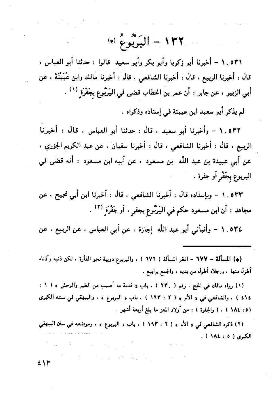 10531 - أَخْبَرَنَا أَبُو بَكْرٍ، وَأَبُو زَكَرِيَّا، وَأَبُو سَعِيدٍ، قَالُوا: حَدَّثَنَا أَبُو الْعَبَّاسِ قَالَ: أَخْبَرَنَا الرَّبِيعُ قَالَ: أَخْبَرَنَا الشَّافِعِيُّ قَالَ: أَخْبَرَنَا مَالِكٌ، وَابْنُ عُيَيْنَةَ، عَنْ أَبِي الزُّبَيْرِ، عَنْ جَابِرٍ: «أَنَّ عُمَرَ بْنَ الْخَطَّابِ، §قَضَى فِي الْيَرْبُوعِ بِجَفْرَةٍ» لَمْ يَذْكُرْ أَبُو سَعِيدٍ ابْنَ عُيَيْنَةَ فِي إِسْنَادِهِ، وَذَكَرَاهُ