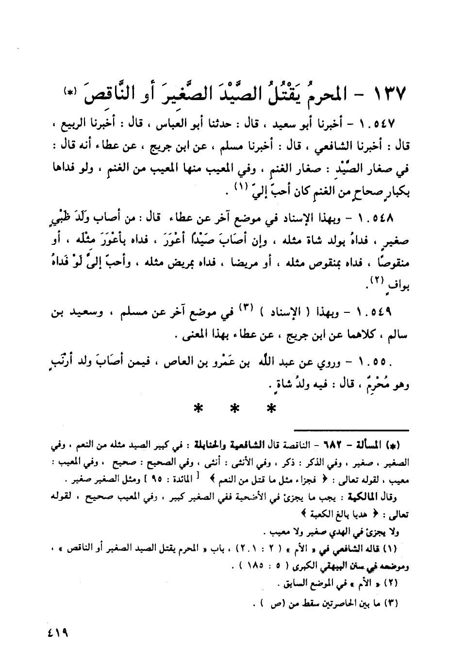 §الْمُحْرِمُ يَقْتُلُ الصَّيْدَ الصَّغِيرَ أَوِ النَّاقِصَ
