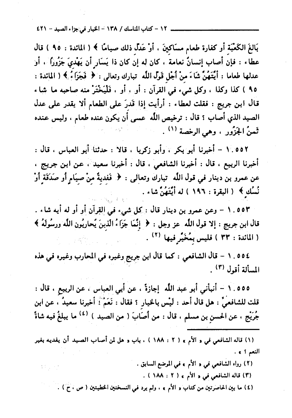 10552 - أَخْبَرَنَا أَبُو بَكْرٍ، وَأَبُو زَكَرِيَّا قَالَا: حَدَّثَنَا أَبُو الْعَبَّاسِ قَالَ: أَخْبَرَنَا الرَّبِيعُ قَالَ: أَخْبَرَنَا الشَّافِعِيُّ قَالَ: أَخْبَرَنَا سَعِيدٌ، عَنِ ابْنِ جُرَيْجٍ، عَنْ عَمْرِو بْنِ دِينَارٍ فِي قَوْلِ اللَّهِ تَبَارَكَ وَتَعَالَى: {§فَفِدْيَةٌ مِنْ صِيَامٍ أَوْ صَدَقَةٍ أَوْ نُسُكٍ} [البقرة: 196]: لَهُ أَيَّتُهُنَّ شَاءَ "