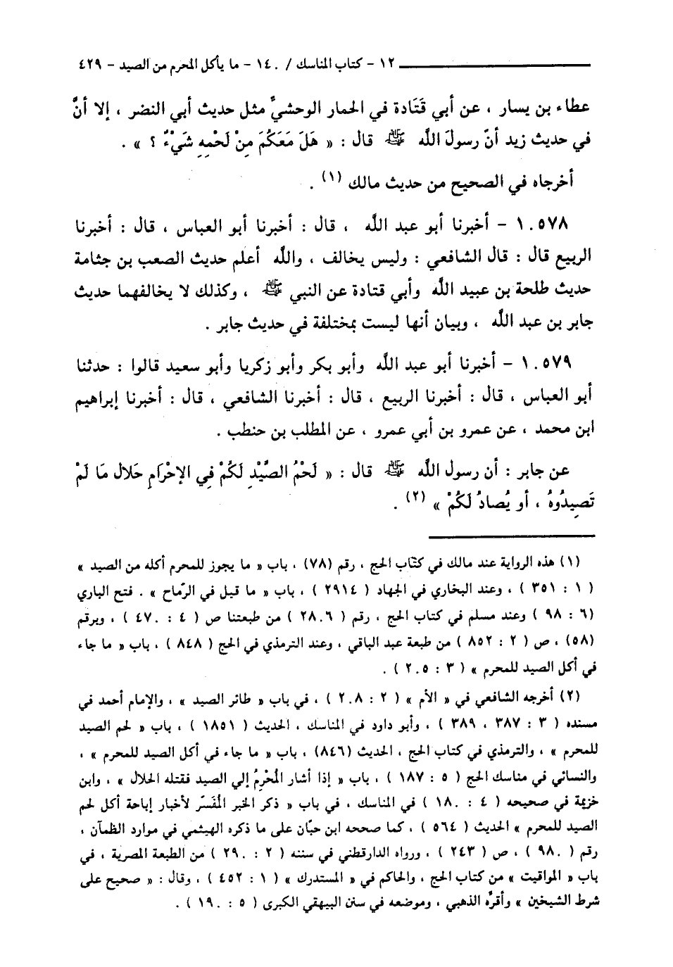 10579 - أَخْبَرَنَا أَبُو عَبْدِ اللَّهِ، وَأَبُو بَكْرٍ، وَأَبُو زَكَرِيَّا، وَأَبُو سَعِيدٍ، قَالُوا: حَدَّثَنَا أَبُو الْعَبَّاسِ قَالَ: أَخْبَرَنَا الرَّبِيعُ قَالَ: أَخْبَرَنَا الشَّافِعِيُّ قَالَ: أَخْبَرَنَا إِبْرَاهِيمُ بْنُ مُحَمَّدٍ، عَنْ عَمْرِو بْنِ أَبِي عَمْرٍو، عَنِ الْمُطَّلِبِ بْنِ حَنْطَبٍ، عَنْ جَابِرٍ، أَنَّ رَسُولَ اللَّهِ صَلَّى اللهُ عَلَيْهِ وَسَلَّمَ قَالَ: «§لَحْمُ الصَّيْدِ لَكُمْ فِي الْإِحْرَامِ حَلَالٌ مَا لَمْ تَصِيدُوهُ، أَوْ يُصَادُ لَكُمْ» -[430]-