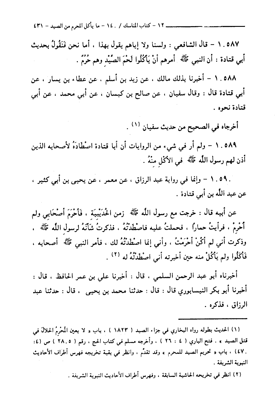 10590 - وَإِنَّمَا فِي رِوَايَةِ عَبْدِ الرَّزَّاقِ، عَنْ مَعْمَرٍ، عَنْ يَحْيَى بْنِ أَبِي كَثِيرٍ، عَنْ عَبْدِ اللَّهِ بْنِ أَبِي قَتَادَةَ، عَنْ أَبِيهِ قَالَ: «خَرَجْتُ مَعَ رَسُولِ اللَّهِ صَلَّى اللهُ عَلَيْهِ وَسَلَّمَ زَمَنَ الْحُدَيْبِيَةِ، فَأَحْرَمَ أَصْحَابِي، وَلَمْ أُحْرِمْ، فَرَأَيْتُ حِمَارًا، فَحَمَلْتُ عَلَيْهِ، فَاصْطَدْتُهُ، فَذَكَرْتُ شَأْنَهُ لِرَسُولِ اللَّهِ صَلَّى اللهُ عَلَيْهِ وَسَلَّمَ، وَذَكَرْتُ أَنِّي لَمْ أَكُنْ أَحْرَمْتُ، وَأَنِّي إِنَّمَا اصْطَدْتُهُ لَكَ، فَأَمَرَ النَّبِيُّ صَلَّى اللهُ عَلَيْهِ وَسَلَّمَ أَصْحَابَهُ فَأَكَلُوا، §وَلَمْ يَأْكُلْ مِنْهُ حِينَ أَخْبَرْتُهُ أَنِّي اصْطَدْتُهُ لَهُ» أَخْبَرَنَاهُ أَبُو عَبْدِ الرَّحْمَنِ السُّلَمِيُّ قَالَ: أَخْبَرَنَا عَلِيُّ بْنُ عُمَرَ الْحَافِظُ قَالَ: أَخْبَرَنَا أَبُو بَكْرٍ النَّيْسَابُورِيُّ قَالَ: قَالَ حَدَّثَنَا مُحَمَّدُ بْنُ يَحْيَى قَالَ: حَدَّثَنَا عَبْدُ الرَّزَّاقِ، فَذَكَرَهُ -[432]-.