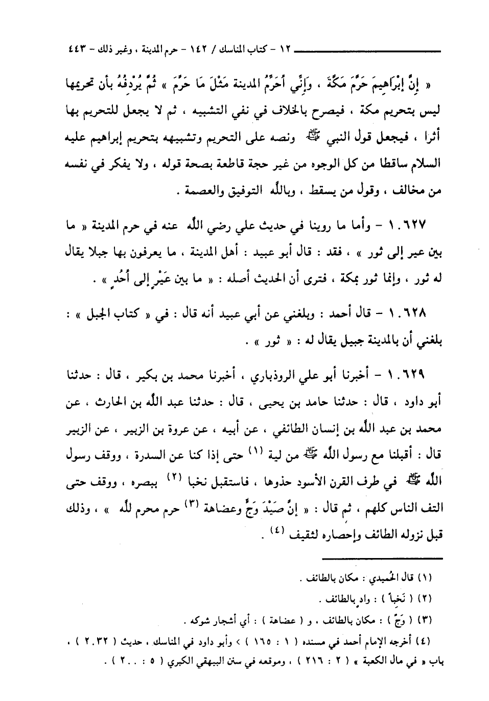 10629 - أَخْبَرَنَا أَبُو عَلِيٍّ الرُّوذْبَارِيُّ، أَخْبَرَنَا مُحَمَّدُ بْنُ بَكْرٍ قَالَ: حَدَّثَنَا أَبُو دَاوُدَ قَالَ: حَدَّثَنَا حَامِدُ بْنُ يَحْيَى قَالَ: حَدَّثَنَا عَبْدُ اللَّهِ بْنُ الْحَارِثِ، عَنْ مُحَمَّدِ بْنِ عَبْدِ اللَّهِ بْنِ إِنْسَانٍ الطَّائِفِيِّ، عَنْ أَبِيهِ، عَنْ عُرْوَةَ بْنِ الزُّبَيْرِ، عَنِ الزُّبَيْرِ قَالَ: أَقْبَلْنَا مَعَ رَسُولِ اللَّهِ صَلَّى اللهُ عَلَيْهِ وَسَلَّمَ مِنْ لَيْلَةٍ حَتَّى إِذَا كُنَّا عِنْدَ السِّدْرَةِ، وَوَقَفَ رَسُولُ اللَّهِ صَلَّى اللهُ عَلَيْهِ وَسَلَّمَ فِي طَرْفِ الْقَرْنِ الْأَسْوَدِ حِذْوَهَا، فَاسْتَقْبَلَ نَخِبًا بِبَصَرِهِ، وَوَقَفَ حَتَّى الْتَفَّ النَّاسُ كُلُّهُمْ، ثُمَّ قَالَ: «إِنَّ §صَيْدَ وَجٍّ وَعَضَاهَةَ حَرَمٌ مُحَرَّمٌ لِلَّهِ» وَذَلِكَ قَبْلَ نُزُولِهِ الطَّائِفَ وَإِحْصَارِهِ لِثَقِيفٍ -[444]-