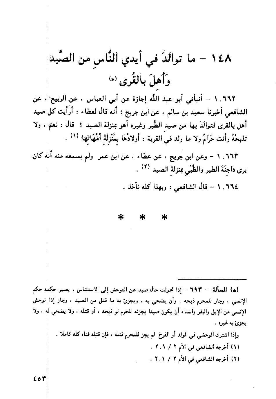 10662 - أَنْبَأَنِي أَبُو عَبْدِ اللَّهِ، إِجَازَةً، عَنْ أَبِي الْعَبَّاسِ، عَنِ الرَّبِيعِ، عَنِ الشَّافِعِيِّ، أَخْبَرَنَا سَعِيدُ بْنُ سَالِمٍ، عَنِ ابْنِ جُرَيْجٍ: أَنَّهُ قَالَ لِعَطَاءٍ: أَرَأَيْتَ كُلَّ صَيْدٍ أَهِلَ بِالْقُرَى فَتَوَالَدَ بِهَا مِنْ صَيْدِ الطَّيْرِ وَغَيْرِهِ أَهُوَ بِمَنْزِلَةِ الصَّيْدِ؟ قَالَ: نَعَمْ، §وَلَا تَذْبَحْهُ وَأَنْتَ حَرَامٌ، وَلَا مَا وَلَدَ فِي الْقَرْيَةِ، أَوْلَادُهَا بِمَنْزِلَةِ أُمَّهَاتِهَا "