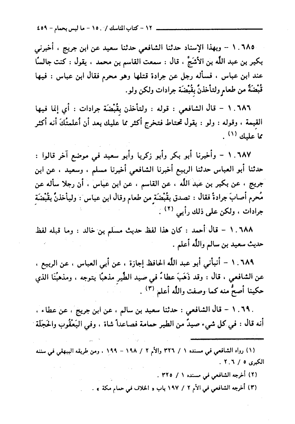 10687 - وَأَخْبَرَنَا أَبُو بَكْرٍ، وأَبُو زَكَرِيَّا، وأَبُو سَعِيدٍ فِي مَوْضِعٍ آخَرَ قَالُوا: حَدَّثَنَا أَبُو الْعَبَّاسِ، حَدَّثَنَا الرَّبِيعُ، أَخْبَرَنَا الشَّافِعِيُّ، أَخْبَرَنَا مُسْلِمٌ، وسَعِيدٌ، عَنِ ابْنِ جُرَيْجٍ، عَنْ بُكَيْرِ بْنِ عَبْدِ اللَّهِ، عَنِ الْقَاسِمِ، عَنِ ابْنِ عَبَّاسٍ، أَنَّ رَجُلًا سَأَلَهُ عَنْ §مُحْرِمٍ أَصَابَ جَرَادَةً فَقَالَ: «تَصَدَّقْ بِقَبْضَةٍ مِنْ طَعَامٍ»، وَقَالَ ابْنُ عَبَّاسٍ: وَلَيَأْخُذَنَّ بِقَبْضَةِ جَرَادَاتٍ، وَلَكِنْ عَلَى ذَلِكَ رَأْيِي.