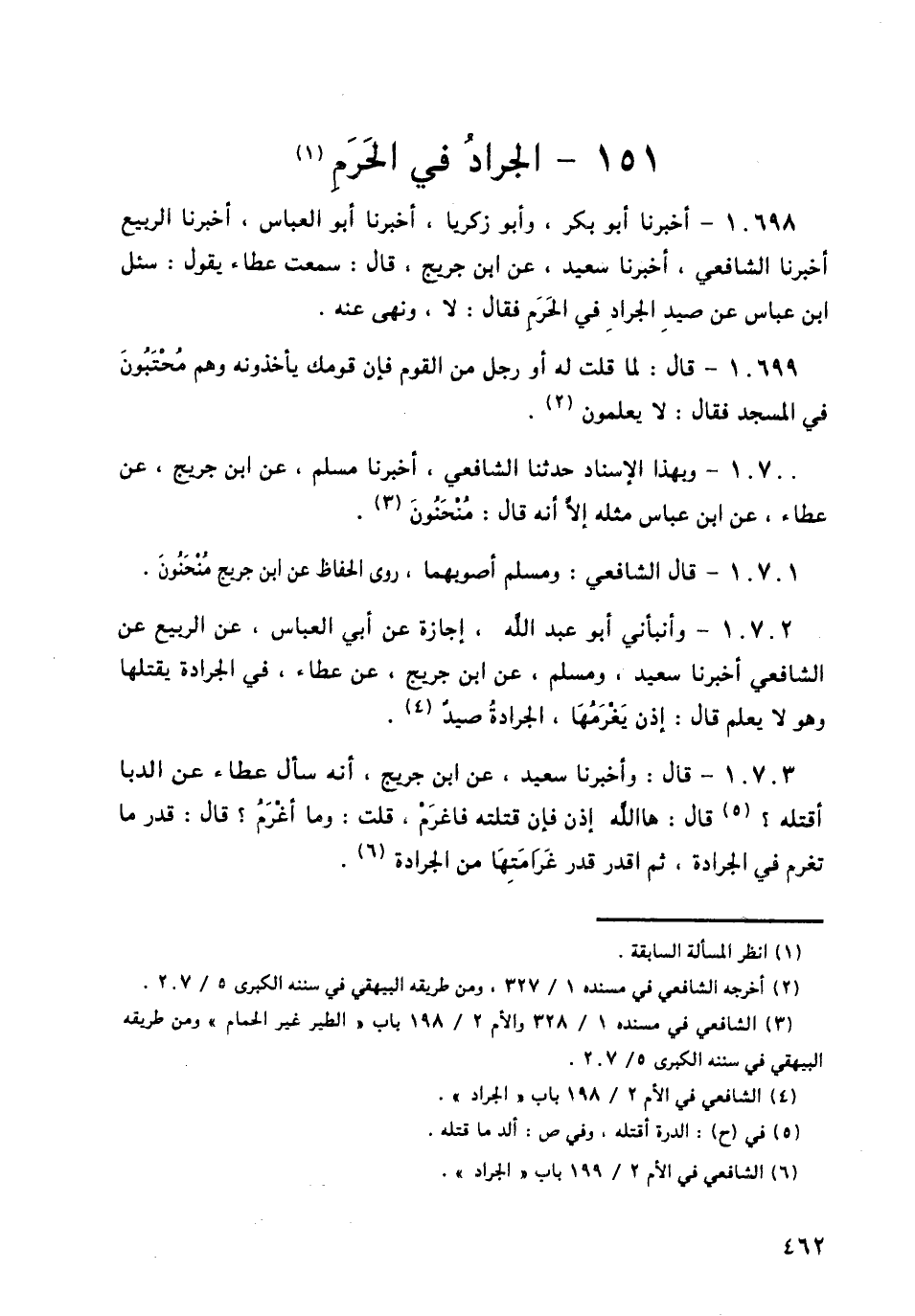 10698 - أَخْبَرَنَا أَبُو بَكْرٍ، وأَبُو زَكَرِيَّا، قَالَا حَدَّثَنَا أَبُو الْعَبَّاسِ، أَخْبَرَنَا الرَّبِيعُ، أَخْبَرَنَا الشَّافِعِيُّ، أَخْبَرَنَا سَعِيدٌ، عَنِ ابْنِ جُرَيْجٍ قَالَ: سَمِعْتُ عَطَاءً، يَقُولُ: سُئِلَ ابْنُ عَبَّاسٍ عَنْ §صَيْدِ الْجَرَادِ فِي الْحَرَمِ فَقَالَ: «لَا»، وَنَهَى عَنْهُ "