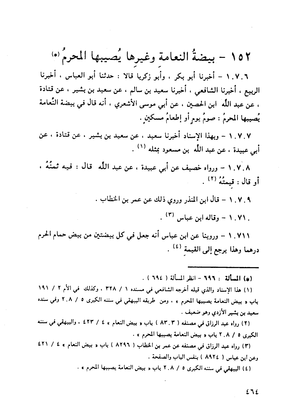 10706 - أَخْبَرَنَا أَبُو بَكْرٍ، وأَبُو زَكَرِيَّا، قَالَا: حَدَّثَنَا أَبُو الْعَبَّاسِ، أَخْبَرَنَا الرَّبِيعُ، أَخْبَرَنَا الشَّافِعِيُّ، أَخْبَرَنَا سَعِيدُ بْنُ سَالِمٍ، عَنْ سَعِيدِ بْنِ بَشِيرٍ، عَنْ قَتَادَةَ، عَنْ عَبْدِ اللَّهِ بْنِ الْحُصَيْنِ، عَنْ أَبِي مُوسَى الْأَشْعَرِيِّ، أَنَّهُ قَالَ §فِي بَيْضَةِ النَّعَامَةِ يُصِيبُهَا الْمُحْرِمُ: «صَوْمُ يَوْمٍ أَوْ إِطَعَامُ مِسْكِينٍ»
