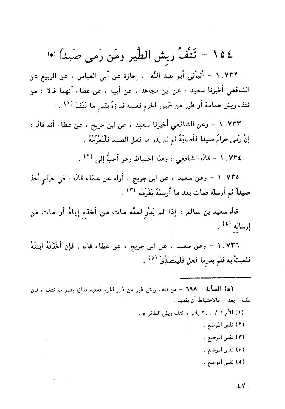 10732 - أَنْبَأَنِي أَبُو عَبْدِ اللَّهِ، إِجَازَةً، عَنْ أَبِي الْعَبَّاسِ، عَنِ الرَّبِيعِ، عَنِ الشَّافِعِيِّ، أَخْبَرَنَا سَعِيدٌ، عَنِ ابْنِ مُجَاهِدٍ، عَنْ أَبِيهِ، عَنْ عَطَاءٍ، أَنَّهُمَا قَالَا: § «مَنْ نَتَفَ رِيشَ حَمَامَةٍ أَوْ طَيْرٍ مِنْ طُيُورِ الْحَرَمِ فَعَلَيْهِ فِدَاؤُهُ بِقَدْرِ مَا نَتَفَ»