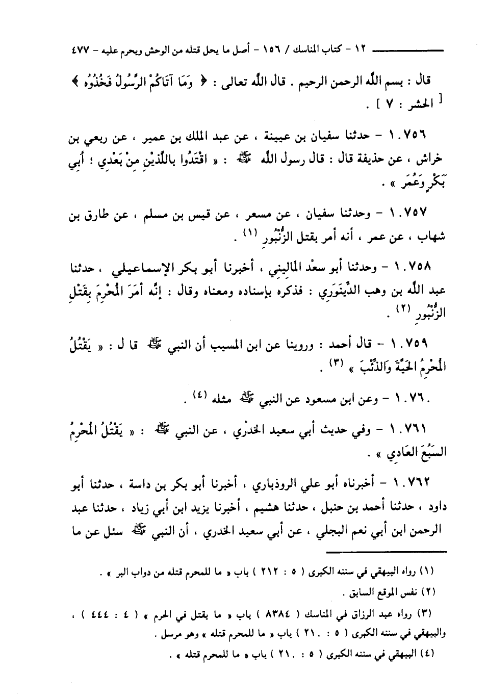 10762 - أَخْبَرَنَاهُ أَبُو عَلِيٍّ الرُّوذْبَارِيُّ، أَخْبَرَنَا أَبُو بَكْرِ بْنُ دَاسَةَ، حَدَّثَنَا أَبُو دَاوُدَ، حَدَّثَنَا أَحْمَدُ بْنُ حَنْبَلٍ، حَدَّثَنَا هُشَيْمٌ، أَخْبَرَنَا يَزِيدُ بْنُ أَبِي زِيَادٍ، حَدَّثَنَا عَبْدُ الرَّحْمَنِ بْنُ أَبِي نُعْمٍ الْبَجَلِيُّ، عَنْ أَبِي سَعِيدٍ الْخُدْرِيِّ، أَنَّ النَّبِيَّ صَلَّى اللهُ عَلَيْهِ وَسَلَّمَ سُئِلَ عَنْ §مَا -[478]- يَقْتُلُ الْمُحْرِمُ قَالَ: «الْحَيَّةَ، وَالْعَقْرَبَ وَالْفُوَيْسِقَةَ، وَيَرْمِي الْغُرَابَ وَلَا يَقْتُلُهُ، وَالْكَلْبَ الْعَقُورَ، وَالْحِدَأَةَ، وَالسَّبُعَ الْعَادِي»