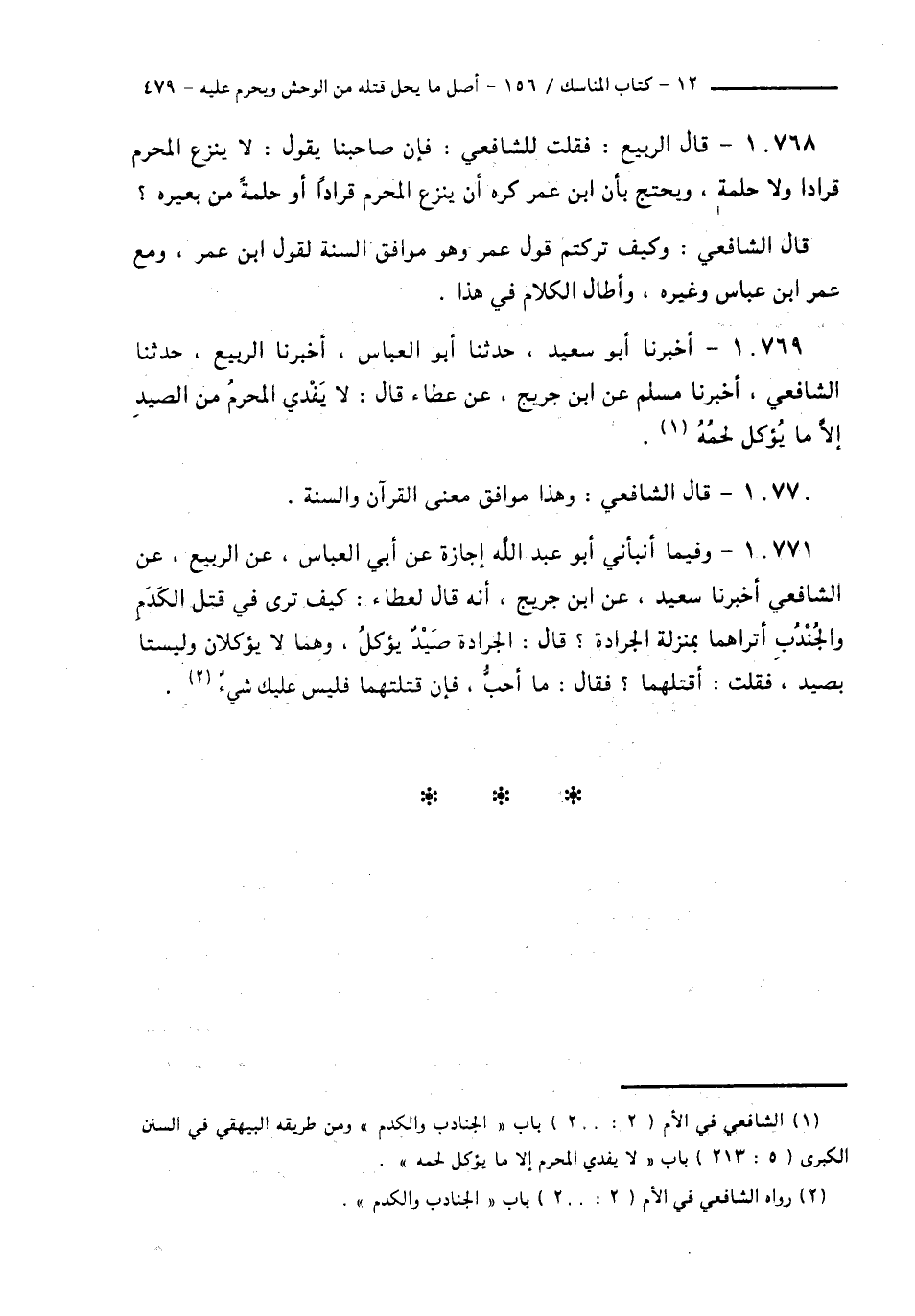 10769 - أَخْبَرَنَا أَبُو سَعِيدٍ، حَدَّثَنَا أَبُو الْعَبَّاسِ، أَخْبَرَنَا الرَّبِيعُ، حَدَّثَنَا الشَّافِعِيُّ، أَخْبَرَنَا مُسْلِمٌ، عَنِ ابْنِ جُرَيْجٍ، عَنْ عَطَاءٍ قَالَ: § «لَا يَفْدِي الْمُحْرِمَ مِنَ الصَّيْدِ إِلَّا مَا يُؤْكَلُ لَحْمُهُ»