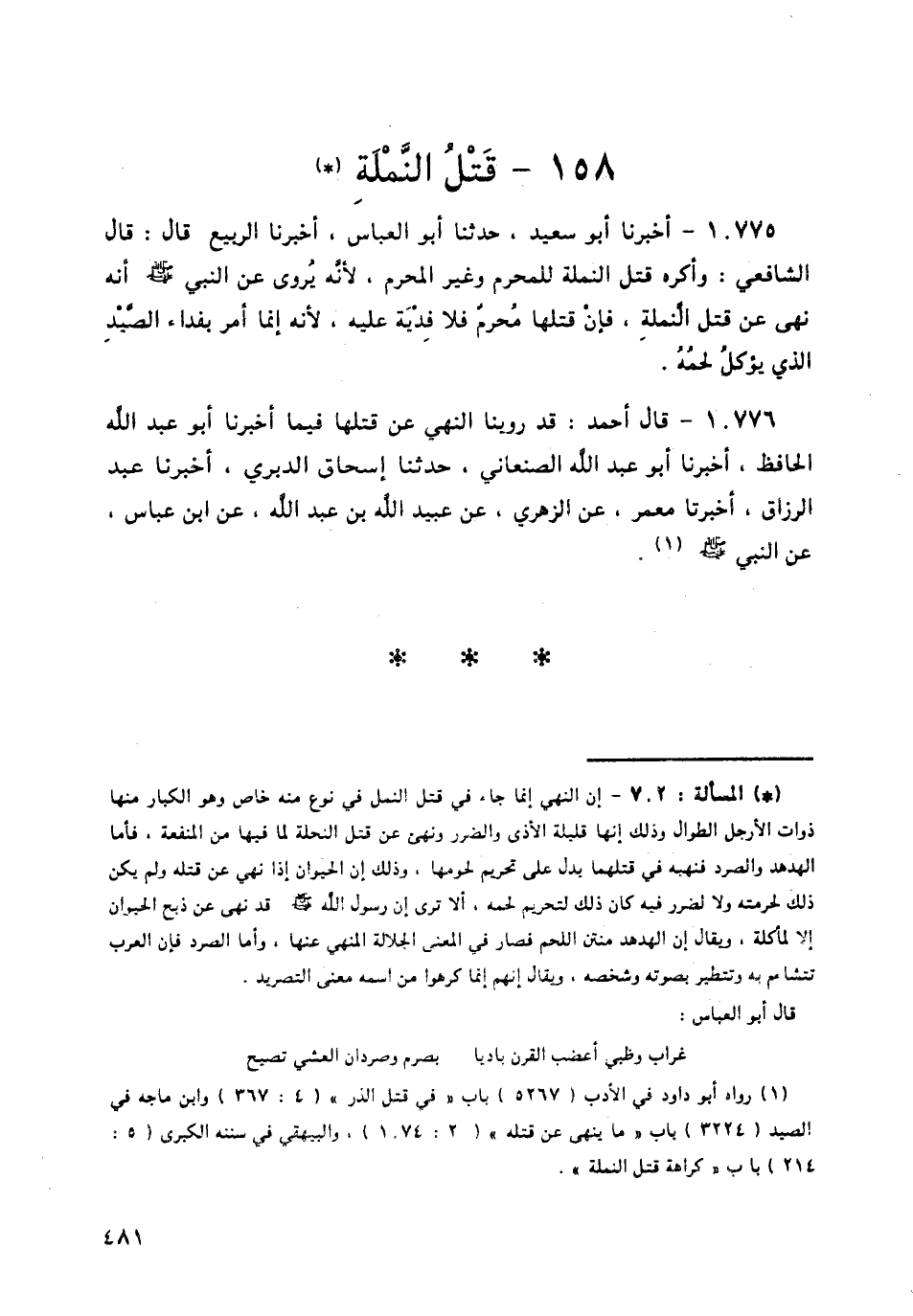 10775 - أَخْبَرَنَا أَبُو سَعِيدٍ، حَدَّثَنَا أَبُو الْعَبَّاسِ، أَخْبَرَنَا الرَّبِيعُ قَالَ: قَالَ الشَّافِعِيُّ: «وَأَكْرَهُ قَتَلَ النَّمْلَةِ لِلْمُحْرِمِ وَغَيْرِ الْمُحْرِمِ؛ لِأَنَّهُ يُرْوَى عَنِ النَّبِيِّ صَلَّى اللهُ عَلَيْهِ وَسَلَّمَ أَنَّهُ §نَهَى عَنْ قَتْلِ النَّمْلَةِ، فَإِنْ قَتَلَهَا مُحْرِمٌ فَلَا فِدْيَةَ عَلَيْهِ؛ لِأَنَّهُ إِنَّمَا أُمِرَ بِفِدَاءِ الصَّيْدِ الَّذِي يُؤْكَلُ لَحْمُهُ»