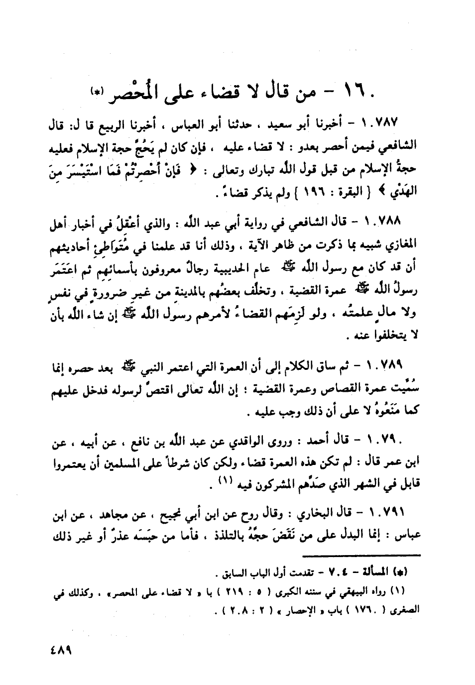 10789 - ثُمَّ سَاقَ الْكَلَامَ إِلَى أَنَّ الْعُمْرَةَ الَّتِي اعْتَمَرَ النَّبِيُّ صَلَّى اللهُ عَلَيْهِ وَسَلَّمَ بَعْدَ حَصْرِهِ إِنَّمَا سَمَّيَتْ عُمْرَةَ الْقِصَاصِ، وَعُمْرَةَ الْقَضِيَّةِ، إِنَّ اللَّهَ تَعَالَى اقْتَصَّ لِرَسُولِهِ فَدَخَلَ عَلَيْهِمْ كَمَا مَنَعُوهُ لَا عَلَى أَنَّ ذَلِكَ وَجَبَ عَلَيْهِ