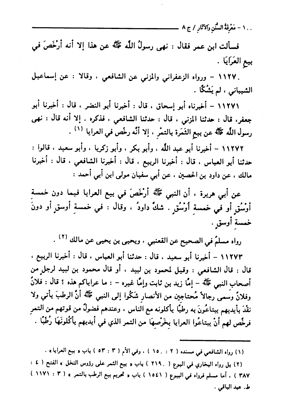 11273 - أَخْبَرَنَا أَبُو سَعِيدٍ قَالَ: حَدَّثَنَا أَبُو الْعَبَّاسِ قَالَ: أَخْبَرَنَا الرَّبِيعُ قَالَ: قَالَ الشَّافِعِيُّ: وَقِيلَ لِمَحْمُودِ بْنِ لَبِيدٍ، أَوْ قَالَ مَحْمُودُ بْنُ لَبِيدٍ لِرَجُلٍ مِنْ أَصْحَابِ النَّبِيِّ صَلَّى اللهُ عَلَيْهِ وَسَلَّمَ، إِمَّا زَيْدُ بْنُ ثَابِتٍ وَإِمَّا غَيْرُهُ: مَا عَرَايَاكُمْ هَذِهِ؟ قَالَ: فُلَانٌ وَفُلَانٌ، وَسَمَّى رِجَالًا مُحْتَاجِينَ مِنَ الْأَنْصَارِ شَكُوا إِلَى النَّبِيِّ صَلَّى اللهُ عَلَيْهِ وَسَلَّمَ: أَنَّ الرُّطَبَ يَأْتِي وَلَا نَقْدَ بِأَيْدِيهِمْ يَبْتَاعُونَ بِهِ رُطَبًا يَأْكُلُونَهُ مَعَ النَّاسِ، وَعِنْدَهُمْ فُضُولٌ مِنْ قُوتِهِمْ مِنَ التَّمْرِ، §فَرَخَّصَ لَهُمْ أَنْ يَبْتَاعُوا الْعَرَايَا بِخَرْصِهَا مِنَ التَّمْرِ الَّذِي فِي أَيْدِيهِمْ يَأْكُلُونَهَا رُطَبًا " -[101]-. هَكَذَا حَكَاهُ فِي كِتَابِ الْبُيُوعِ،