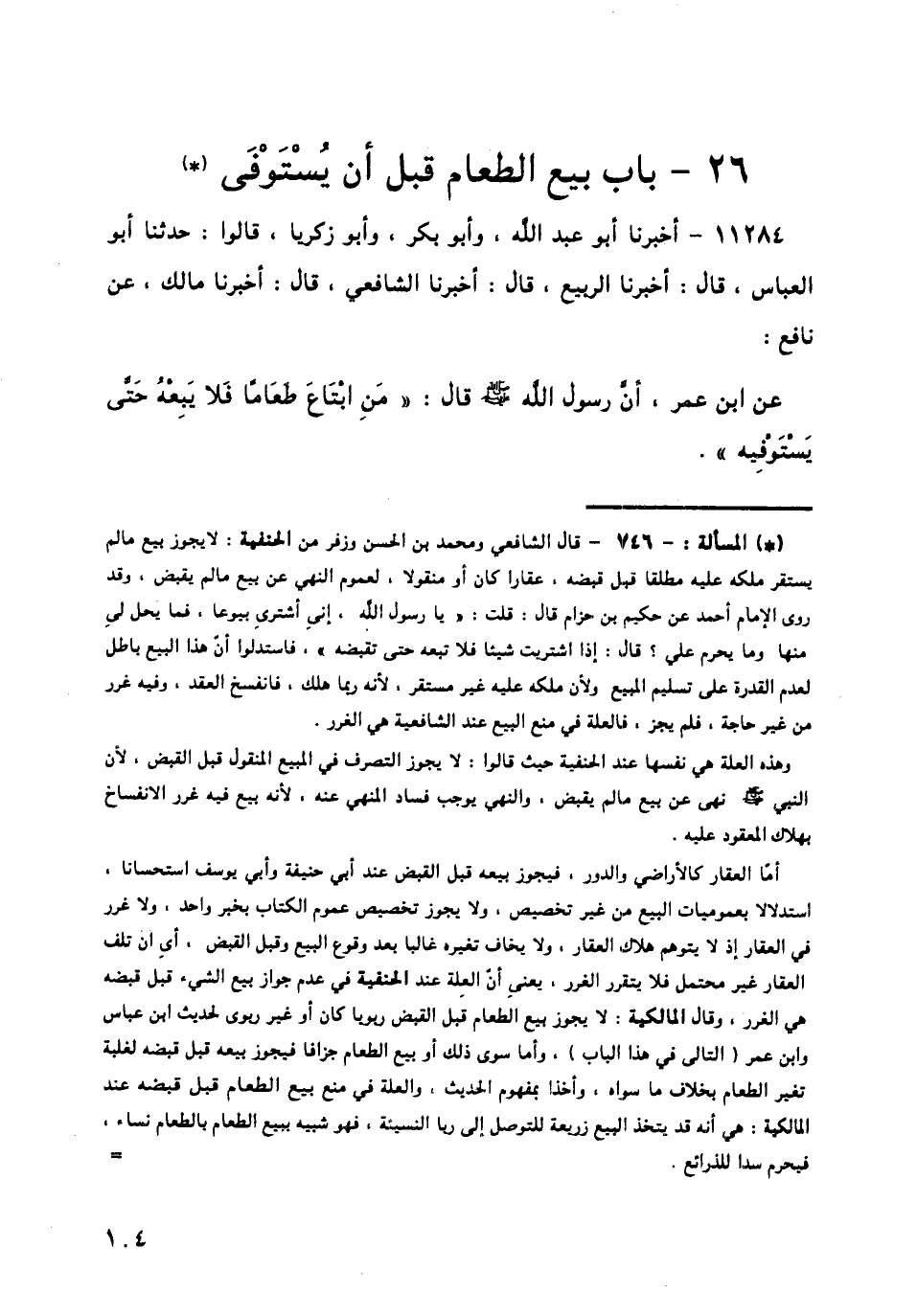 11284 - أَخْبَرَنَا أَبُو عَبْدِ اللَّهِ، وَأَبُو بَكْرٍ، وَأَبُو زَكَرِيَّا، قَالُوا: حَدَّثَنَا أَبُو الْعَبَّاسِ قَالَ: أَخْبَرَنَا الرَّبِيعُ قَالَ: أَخْبَرَنَا الشَّافِعِيُّ قَالَ: أَخْبَرَنَا مَالِكٌ، عَنْ نَافِعٍ، عَنِ ابْنِ عُمَرَ، أَنَّ رَسُولَ اللَّهِ صَلَّى اللهُ عَلَيْهِ وَسَلَّمَ قَالَ: § «مَنِ ابْتَاعَ طَعَامًا فَلَا يَبِعْهُ حَتَّى يَسْتَوْفِيَهُ» -[105]-. أَخْرَجَهُ الْبُخَارِيُّ، وَمُسْلِمٌ فِي الصَّحِيحِ، مِنْ حَدِيثِ مَالِكٍ