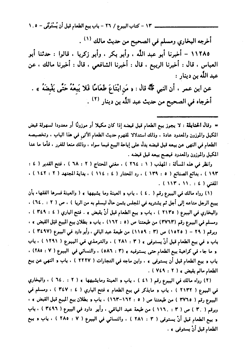 11285 - أَخْبَرَنَا أَبُو عَبْدِ اللَّهِ، وَأَبُو بَكْرٍ، وَأَبُو زَكَرِيَّا، قَالُوا: حَدَّثَنَا أَبُو الْعَبَّاسِ قَالَ: أَخْبَرَنَا الرَّبِيعُ قَالَ: أَخْبَرَنَا الشَّافِعِيُّ قَالَ: أَخْبَرَنَا مَالِكٌ، عَنْ عَبْدِ اللَّهِ بْنِ دِينَارٍ، عَنِ ابْنِ عُمَرَ، أَنَّ النَّبِيَّ صَلَّى اللهُ عَلَيْهِ وَسَلَّمَ قَالَ: § «مَنِ ابْتَاعَ طَعَامًا فَلَا يَبِعْهُ حَتَّى يَقْبِضَهُ». أَخْرَجَاهُ فِي الصَّحِيحِ، مِنْ حَدِيثِ عَبْدِ اللَّهِ بْنِ دِينَارٍ