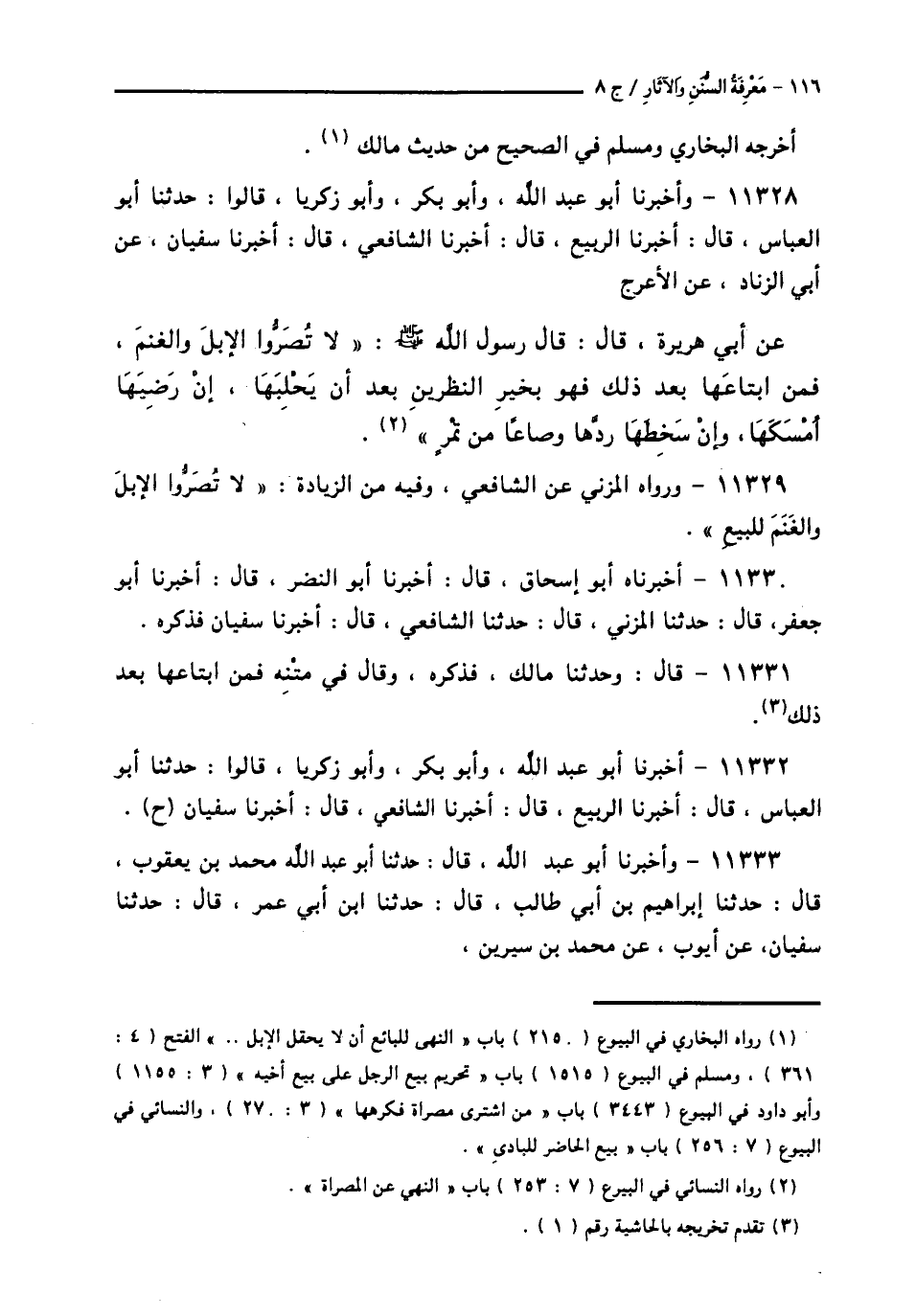 11328 - وَأَخْبَرَنَا أَبُو عَبْدِ اللَّهِ، وَأَبُو بَكْرٍ، وَأَبُو زَكَرِيَّا، قَالُوا: حَدَّثَنَا أَبُو الْعَبَّاسِ قَالَ: أَخْبَرَنَا الرَّبِيعُ قَالَ: أَخْبَرَنَا الشَّافِعِيُّ قَالَ: أَخْبَرَنَا سُفْيَانُ، عَنْ أَبِي الزِّنَادِ، عَنِ الْأَعْرَجِ، عَنْ أَبِي هُرَيْرَةَ قَالَ: قَالَ رَسُولُ اللَّهِ صَلَّى اللهُ عَلَيْهِ وَسَلَّمَ: «§لَا تُصَرُّوا الْإِبِلَ وَالْغَنَمَ، فَمَنِ ابْتَاعَهَا بَعْدَ ذَلِكَ فَهُوَ بِخَيْرِ النَّظَرَيْنِ بَعْدَ أَنْ يَحْلُبَهَا، إِنْ رَضِيَهَا أَمْسَكَهَا، وَإِنْ سَخِطَهَا رَدَّهَا وَصَاعًا مِنْ تَمْرٍ»