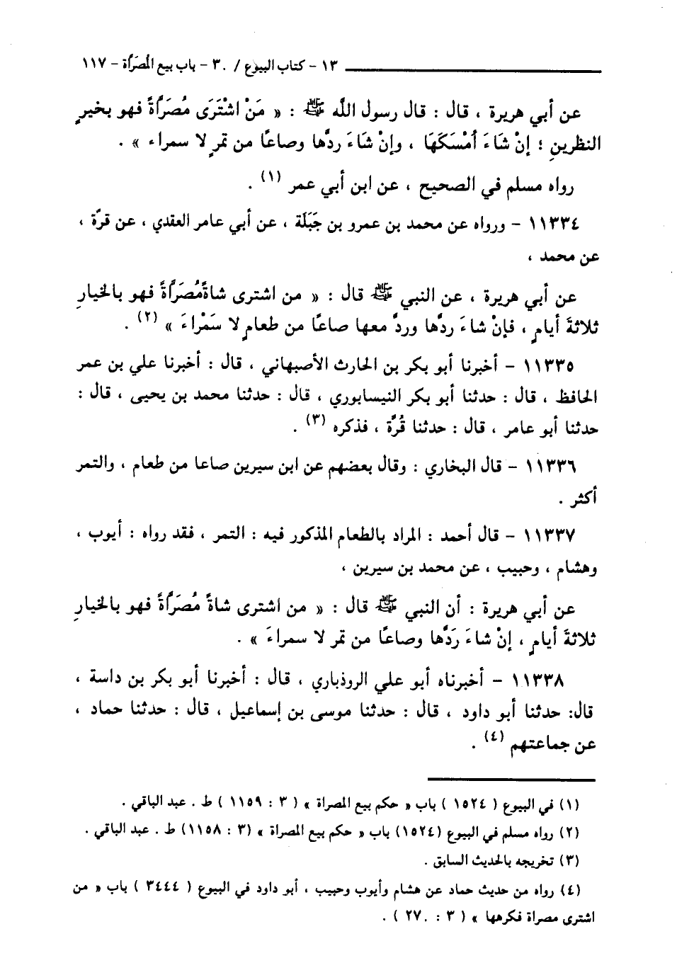 11334 - وَرَوَاهُ عَنْ مُحَمَّدِ بْنِ عَمْرِو بْنِ جَبَلَةَ، عَنْ أَبِي عَامِرٍ الْعَقَدِيِّ، عَنْ قُرَّةَ، عَنْ مُحَمَّدٍ، عَنْ أَبِي هُرَيْرَةَ، عَنِ النَّبِيِّ صَلَّى اللهُ عَلَيْهِ وَسَلَّمَ قَالَ: «§مَنِ اشْتَرَى شَاةً مُصَرَّاةً فَهُوَ بِالْخِيَارِ ثَلَاثَةَ أَيَّامٍ، فَإِنْ شَاءَ رَدَّهَا وَرَدَّ مَعَهَا صَاعًا مِنْ طَعَامٍ لَا سَمْرَاءَ».