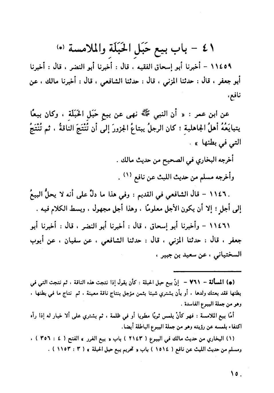 11459 - أَخْبَرَنَا أَبُو إِسْحَاقَ الْفَقِيهُ قَالَ: أَخْبَرَنَا أَبُو النَّضْرِ قَالَ: أَخْبَرَنَا أَبُو جَعْفَرٍ قَالَ: حَدَّثَنَا الْمُزَنِيُّ قَالَ: حَدَّثَنَا الشَّافِعِيُّ قَالَ: أَخْبَرَنَا مَالِكٌ، عَنْ نَافِعٍ، عَنِ ابْنِ عُمَرَ: أَنَّ النَّبِيَّ صَلَّى اللهُ عَلَيْهِ وَسَلَّمَ: § «نَهَى عَنْ بَيْعِ حَبَلِ الْحَبَلَةَ، وَكَانَ بَيْعًا يَتَبَايَعُهُ أَهْلُ الْجَاهِلِيَّةِ، كَانَ الرَّجُلُ يَبْتَاعُ الْجَزُورَ إِلَى أَنْ تُنْتَجَ النَّاقَةُ، ثُمَّ تُنْتَجَ الَّتِي فِي بَطْنِهَا». أَخْرَجَهُ الْبُخَارِيُّ فِي الصَّحِيحِ، مِنْ حَدِيثِ مَالِكٍ، وَأَخْرَجَهُ مُسْلِمٌ، مِنْ حَدِيثِ اللَّيْثِ، عَنْ نَافِعٍ.